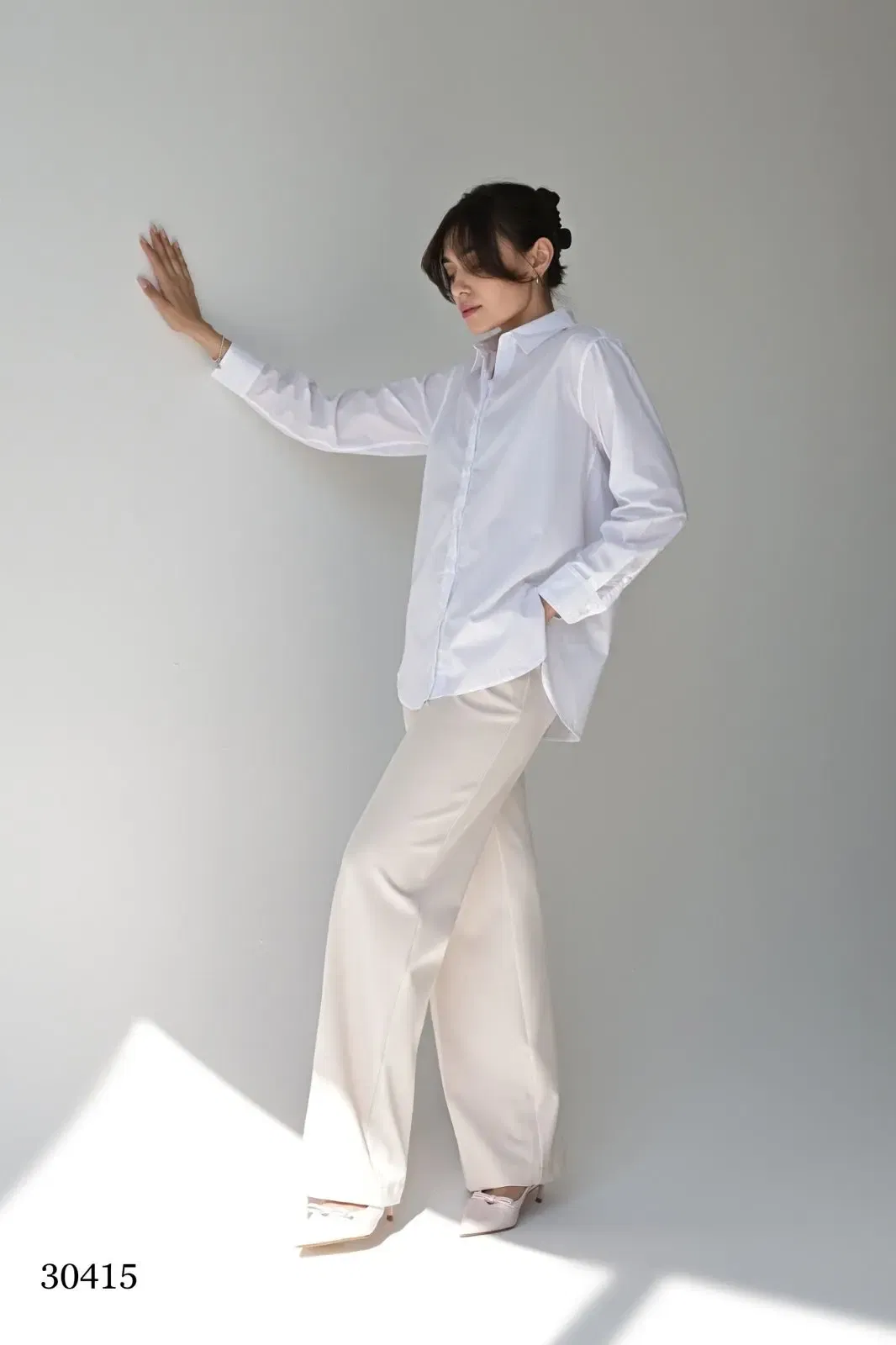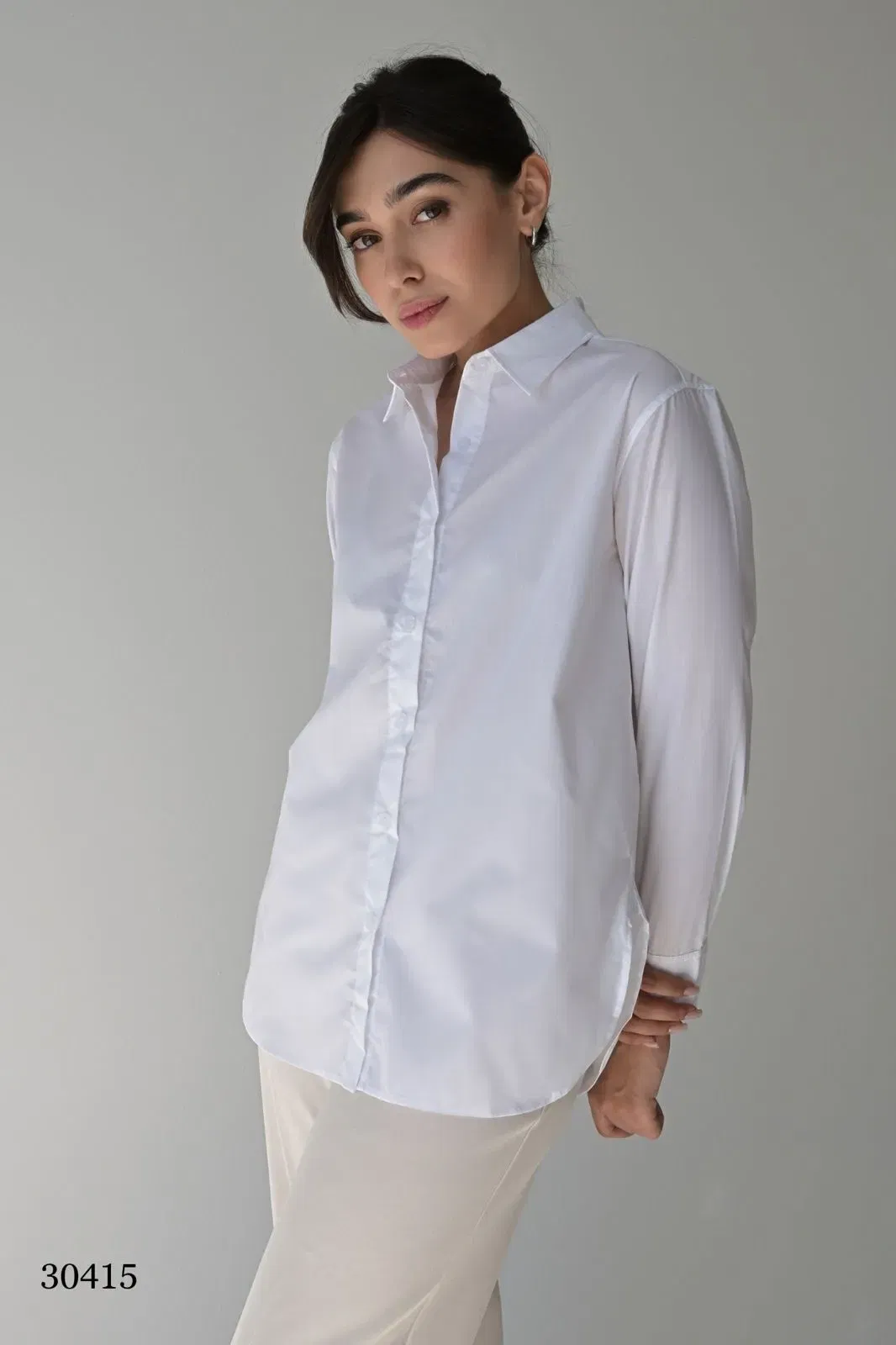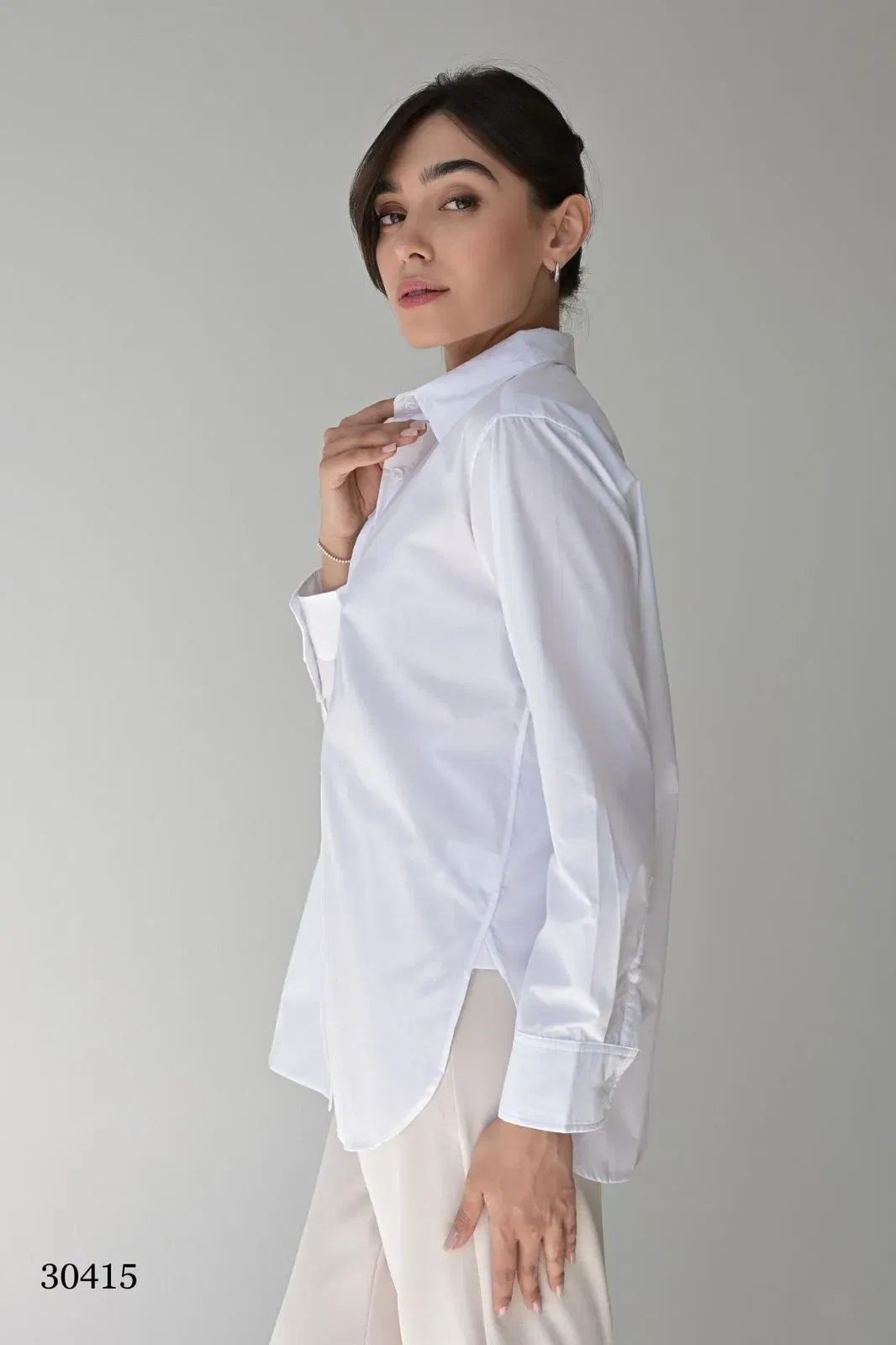 Белая рубашка выполнена в чистом классическом оттенке, что делает её универсальной и элегантной основой гардероба. Модель имеет прямой силуэт, длинные рукава с манжетами на пуговицах и отложной воротник средней ширины, аккуратно прилегающий к шее. Ткань — гладкая, с лёгким благородным блеском (шёлк или качественная синтетика, имитирующая шёлк). Центральная застёжка на пуговицы проходит вертикально по всей длине. Благодаря свободному крою рубашку можно носить как заправленной, так и поверх брюк или юбки.