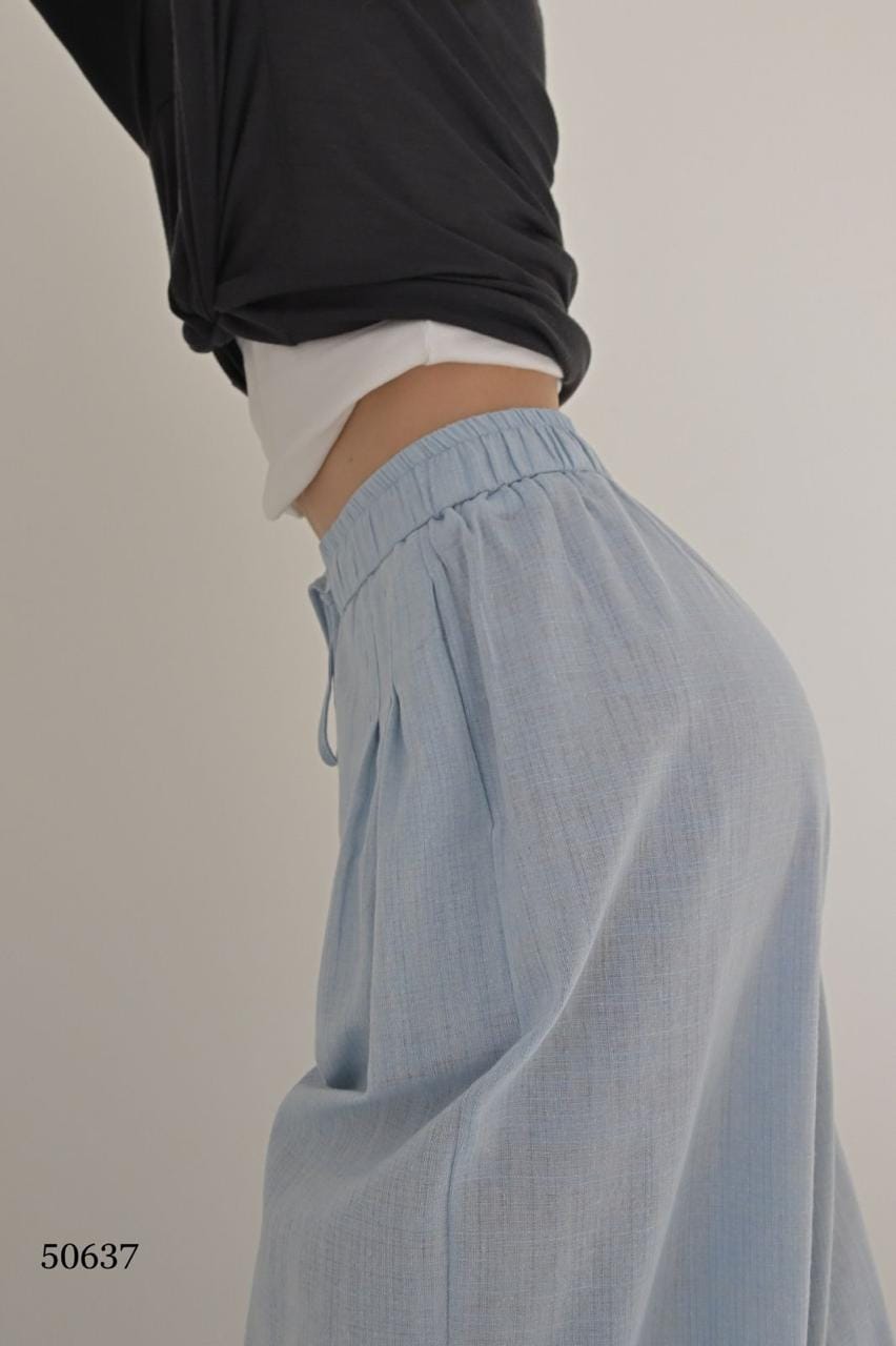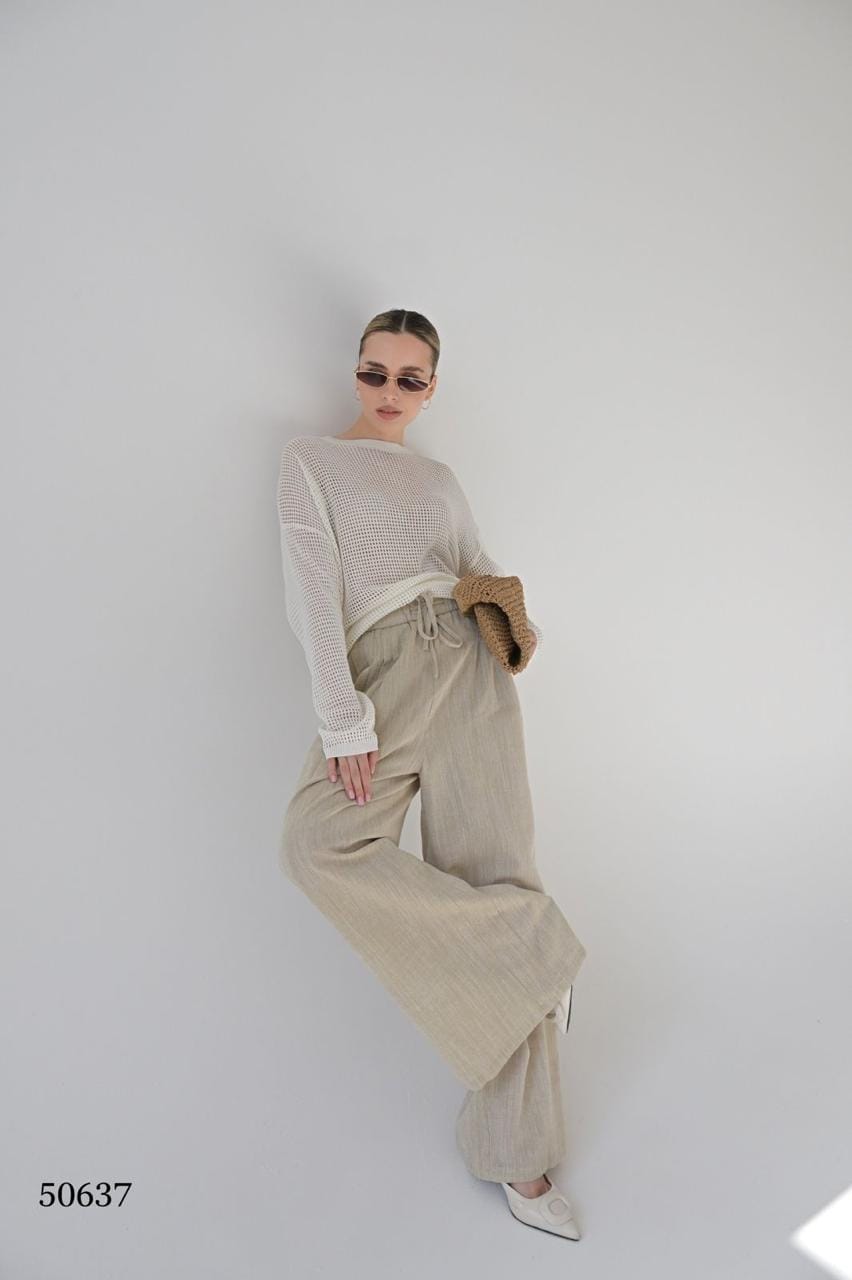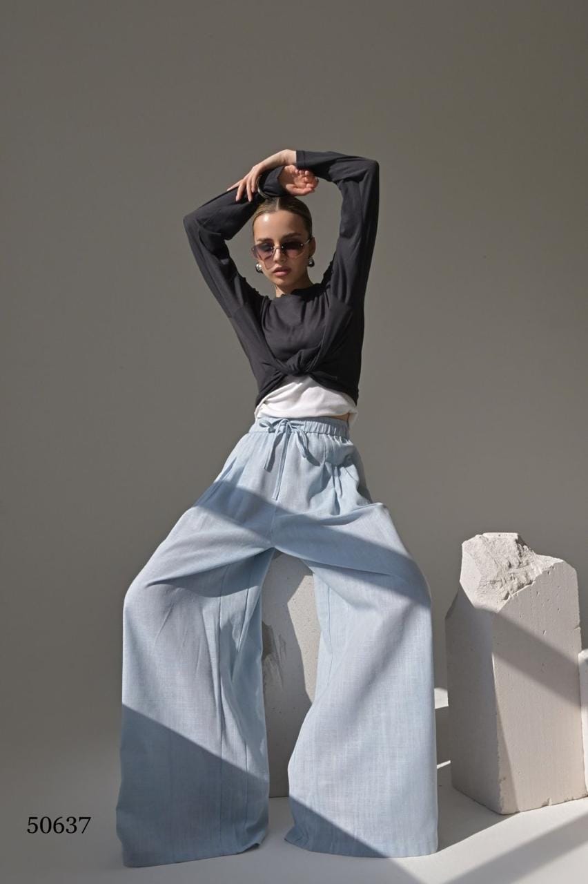 Лёгкие брюки прямого кроя из льняной ткани — идеальный вариант для тех, кто ценит комфорт и стиль. Эластичная талия на резинке обеспечивает удобную посадку, а свободный силуэт визуально вытягивает ноги. Отлично подойдут как для офиса, так и для прогулок или поездок.