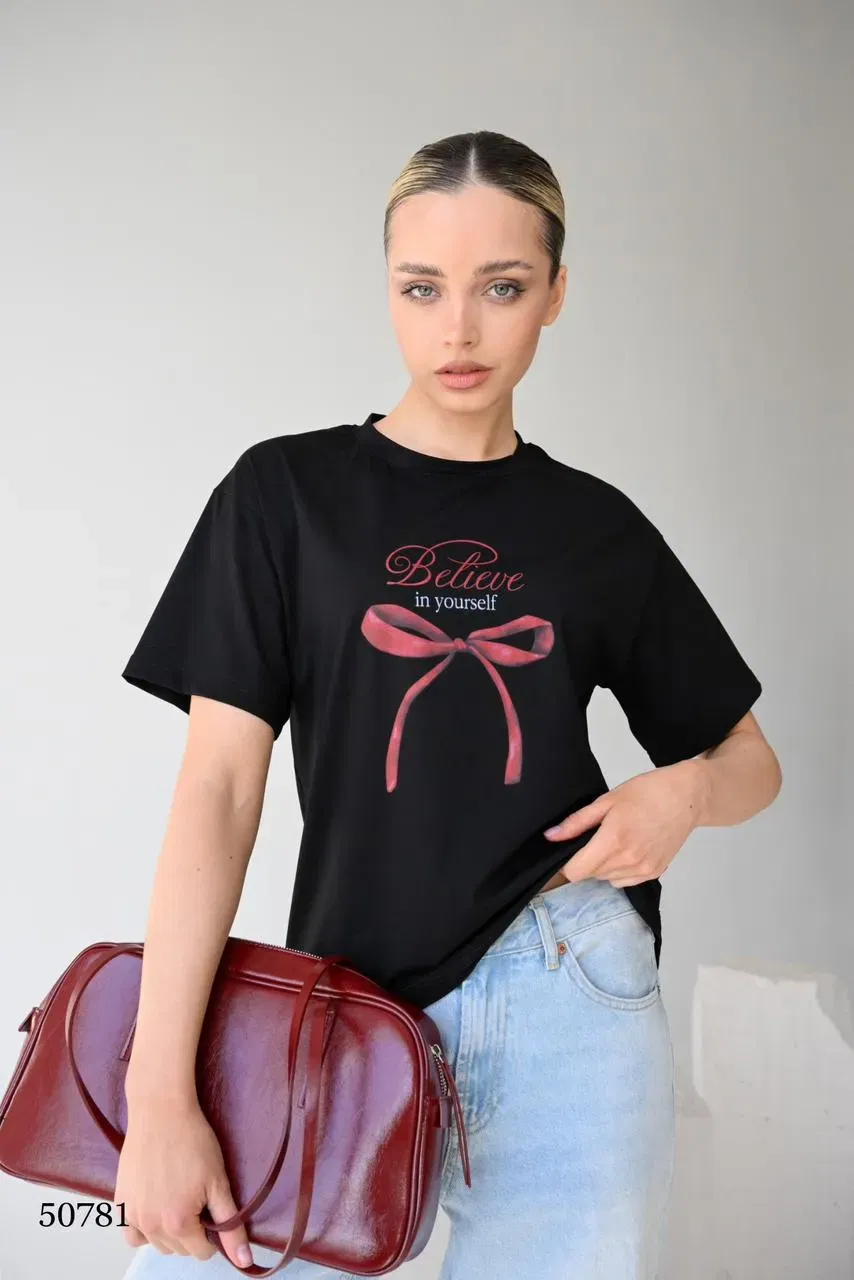 Чёрная футболка с надписью "Believe in yourself" и красной лентой MISS DIVA