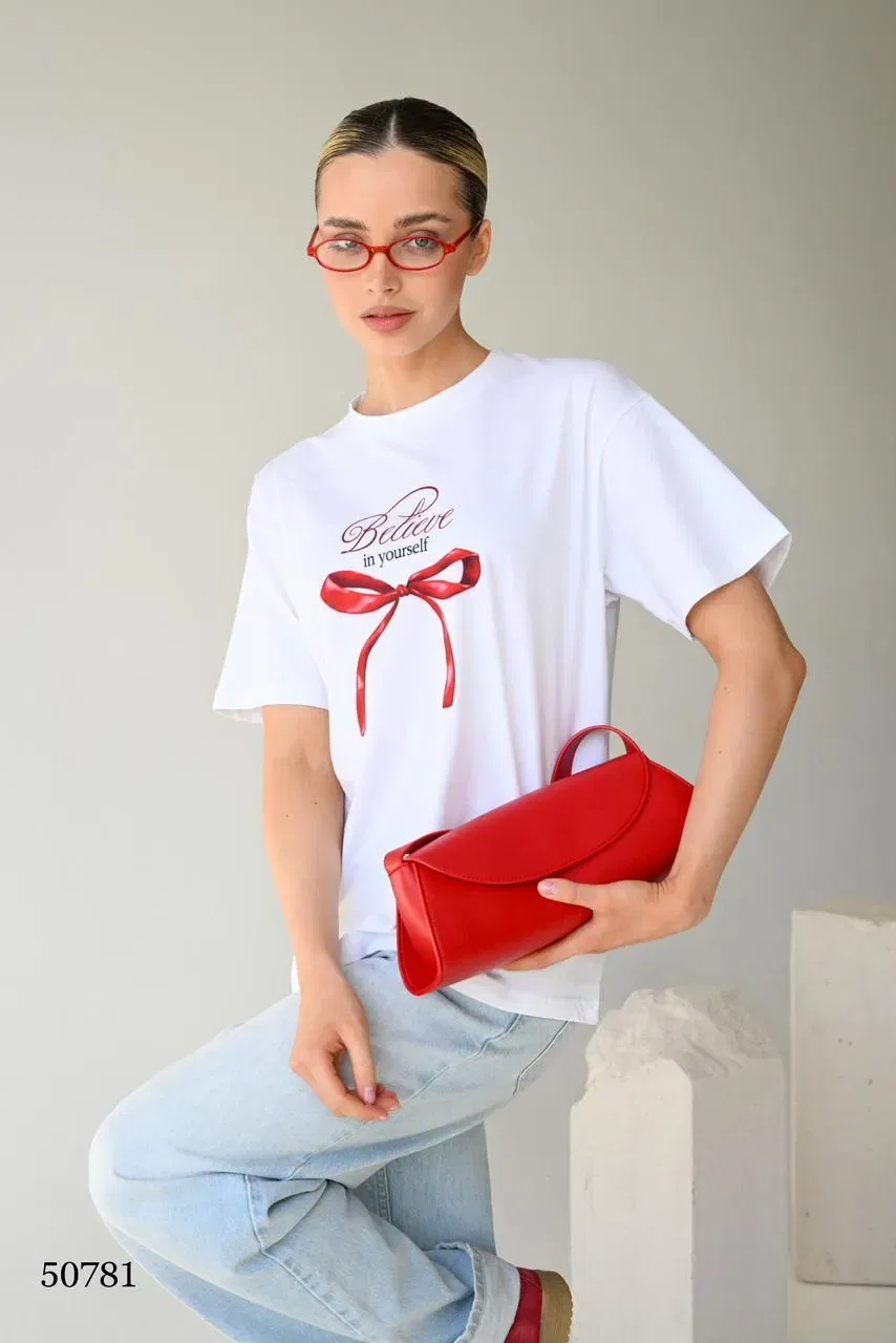 Эта стильная футболка с короткой надписью "Believe in yourself" и декоративной красной лентой станет вашим вдохновляющим аксессуаром. Лаконичный дизайн и яркий элемент декора придают ей уникальный характер, делая её идеальной для повседневных образов. Футболка выполнена из приятного к телу материала, который обеспечивает комфорт в любое время суток. Этот предмет гардероба подойдет как для прогулок, так и для занятий спортом, подчеркивая вашу уверенность и индивидуальность.