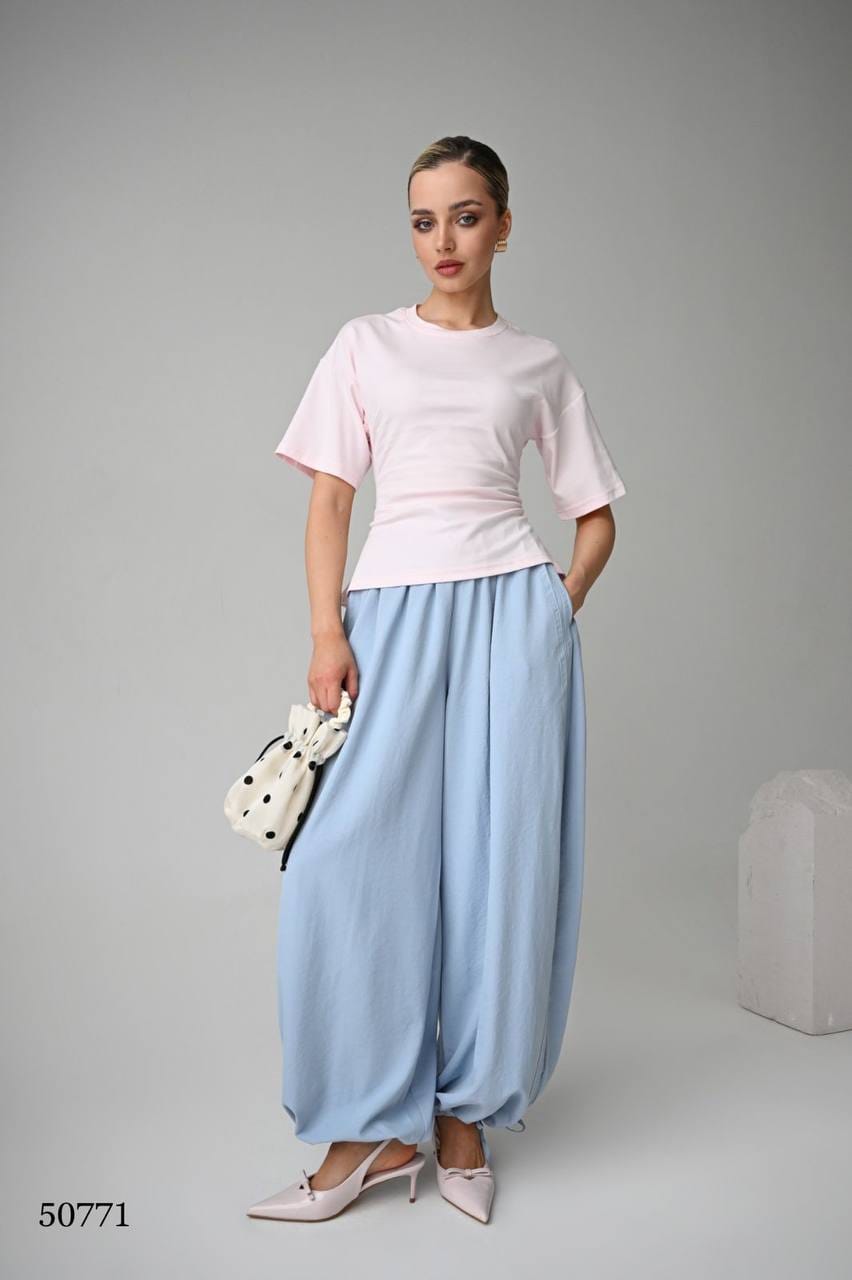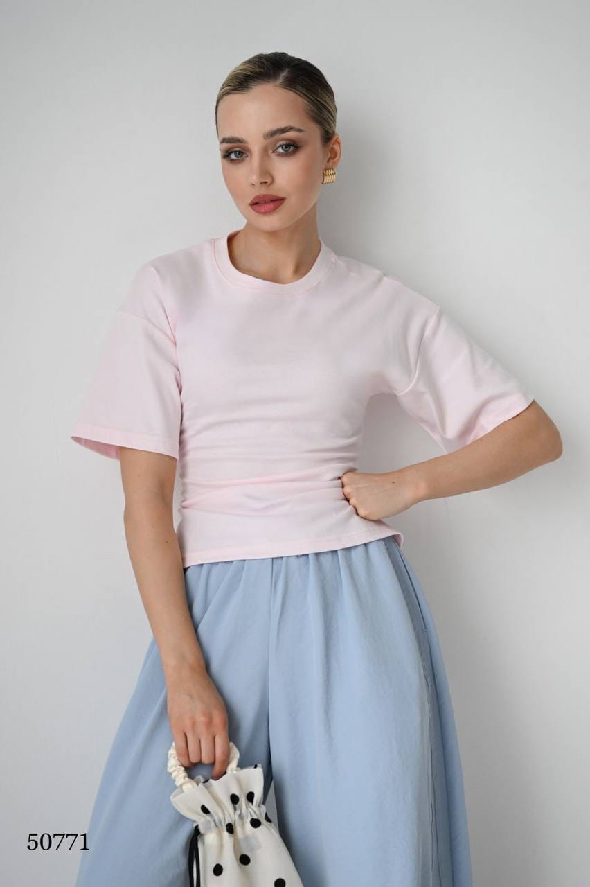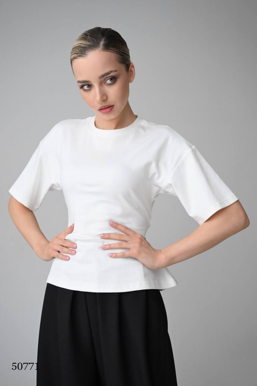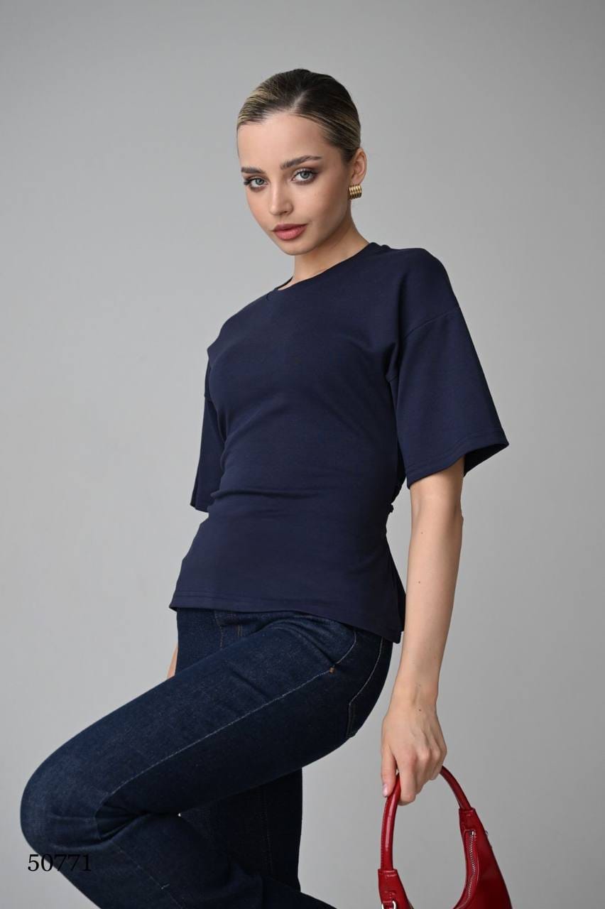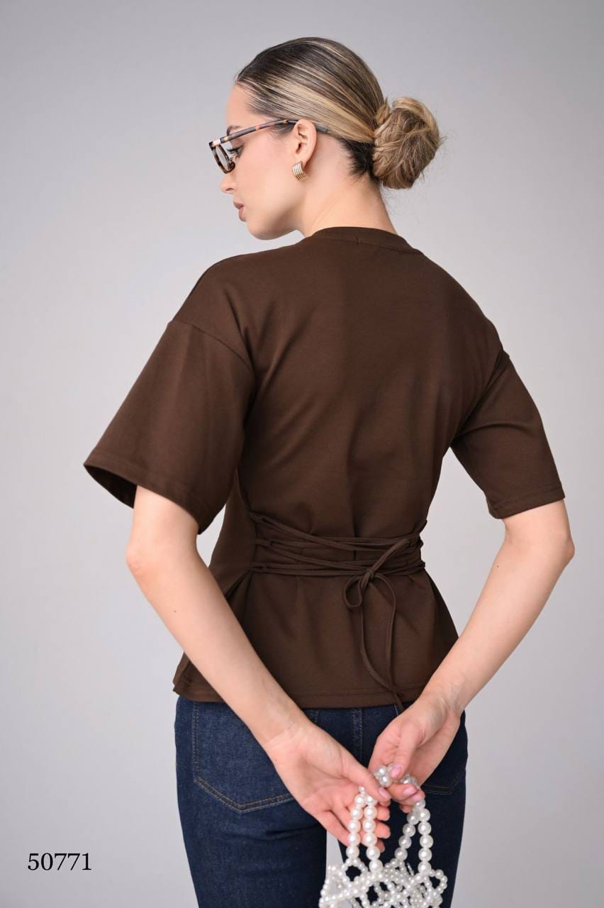 Эта футболка — идеальный пример того, как маленькая деталь может преобразить всю вещь. На первый взгляд — классическая приталенная модель. Но стоит повернуться спиной, и в игру вступают изящные завязки, которые добавляют образу женственности и игривости.