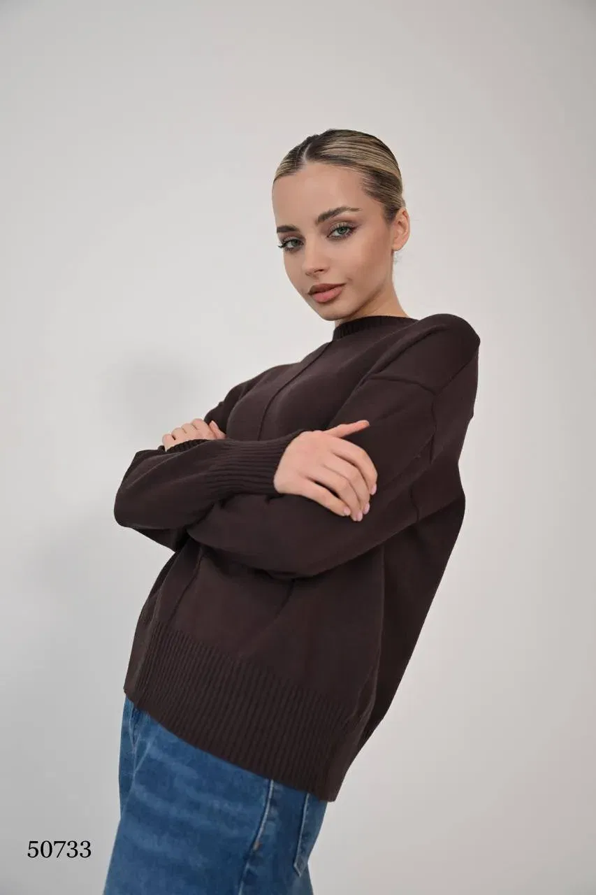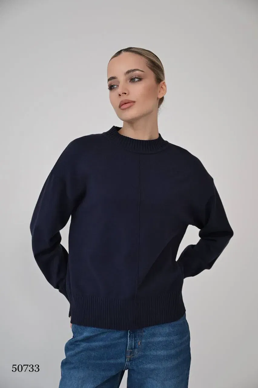 Классический вязаный свитер свободного кроя — идеальный выбор для комфортного и стильного образа каждый день. Модель имеет длинные рукава, круглый воротник с резинкой и аккуратную резинку по низу изделия, которая обеспечивает посадку и завершённый вид. Материал выглядит мягким и плотным, что характерно для качественных шерстяных или акриловых изделий. Свитер подчёркивает комфорт и универсальность, легко сочетается с джинсами, брюками, юбками.