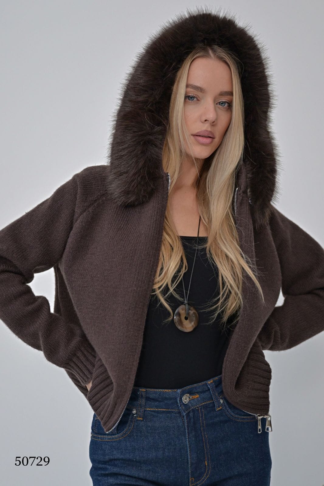 Тёплая кофта с капюшоном, украшенным пушистой меховой отделкой — уют и стиль в одном образе