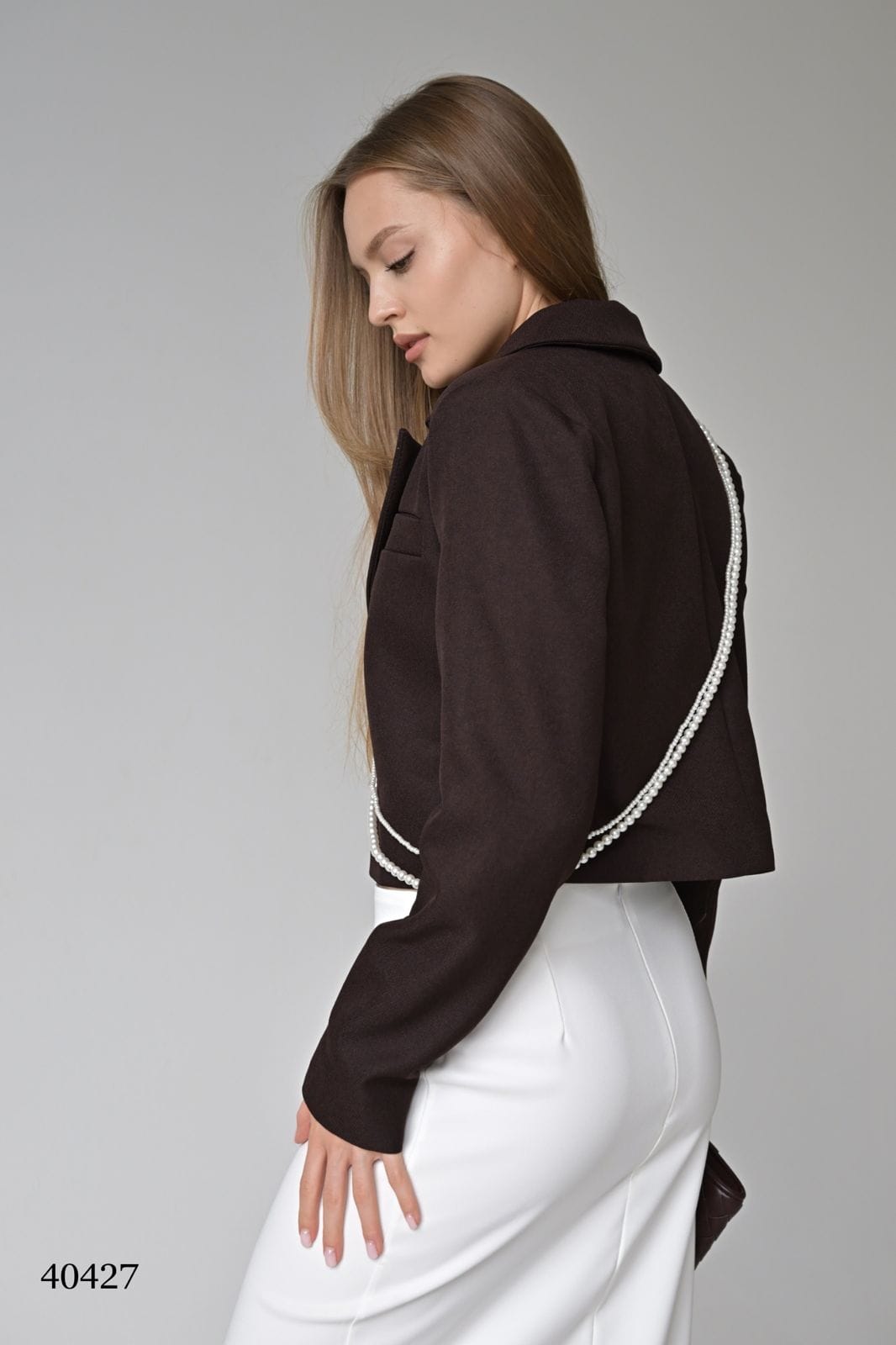 Особенности ............................................. Укороченный крой — подчёркивает линию талии Классический лацкан — строгий и универсальный Коричневый цвет — тренд сезона, тёплый и благородный Женская модель — для офиса, города, прогулок