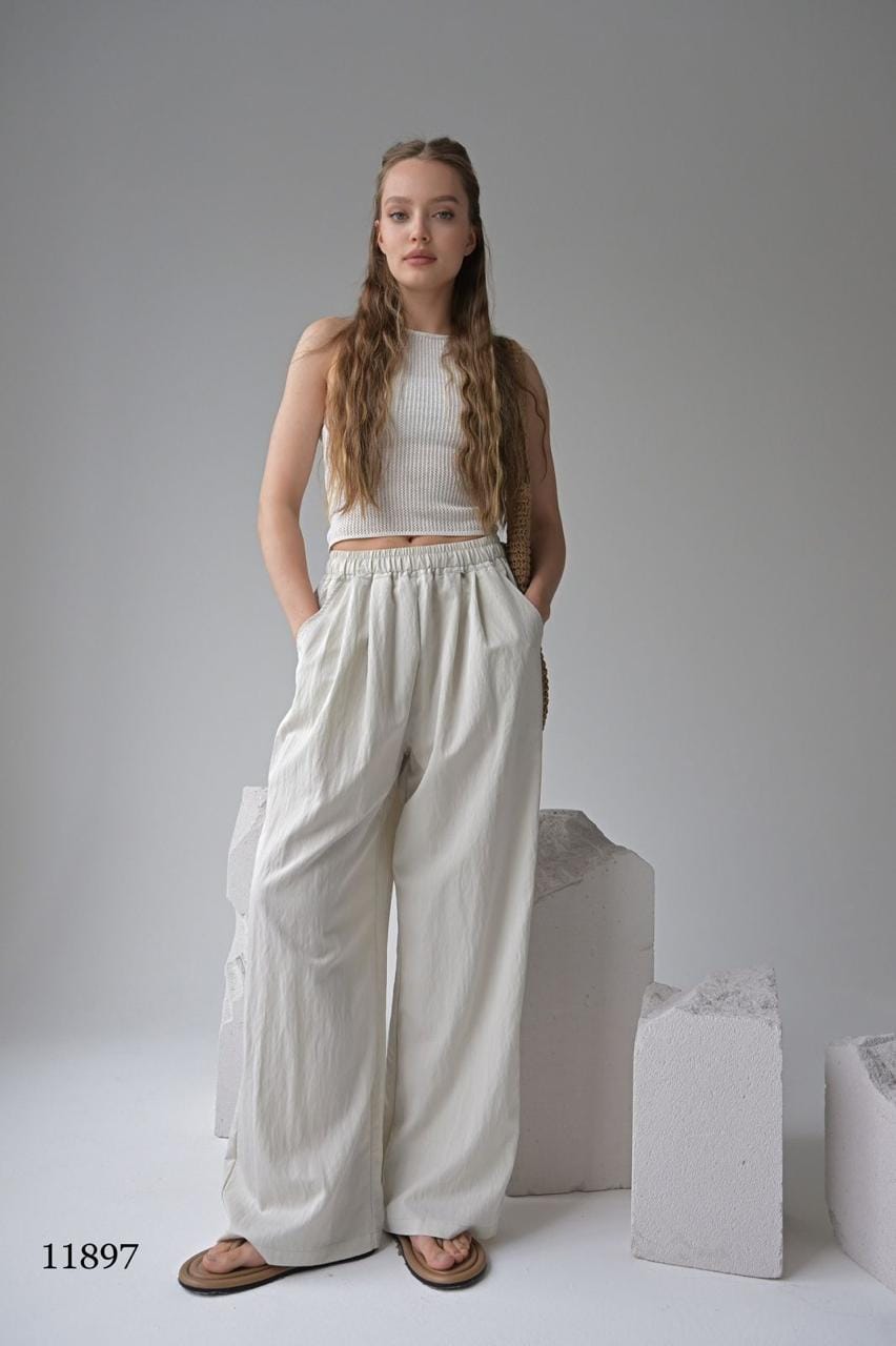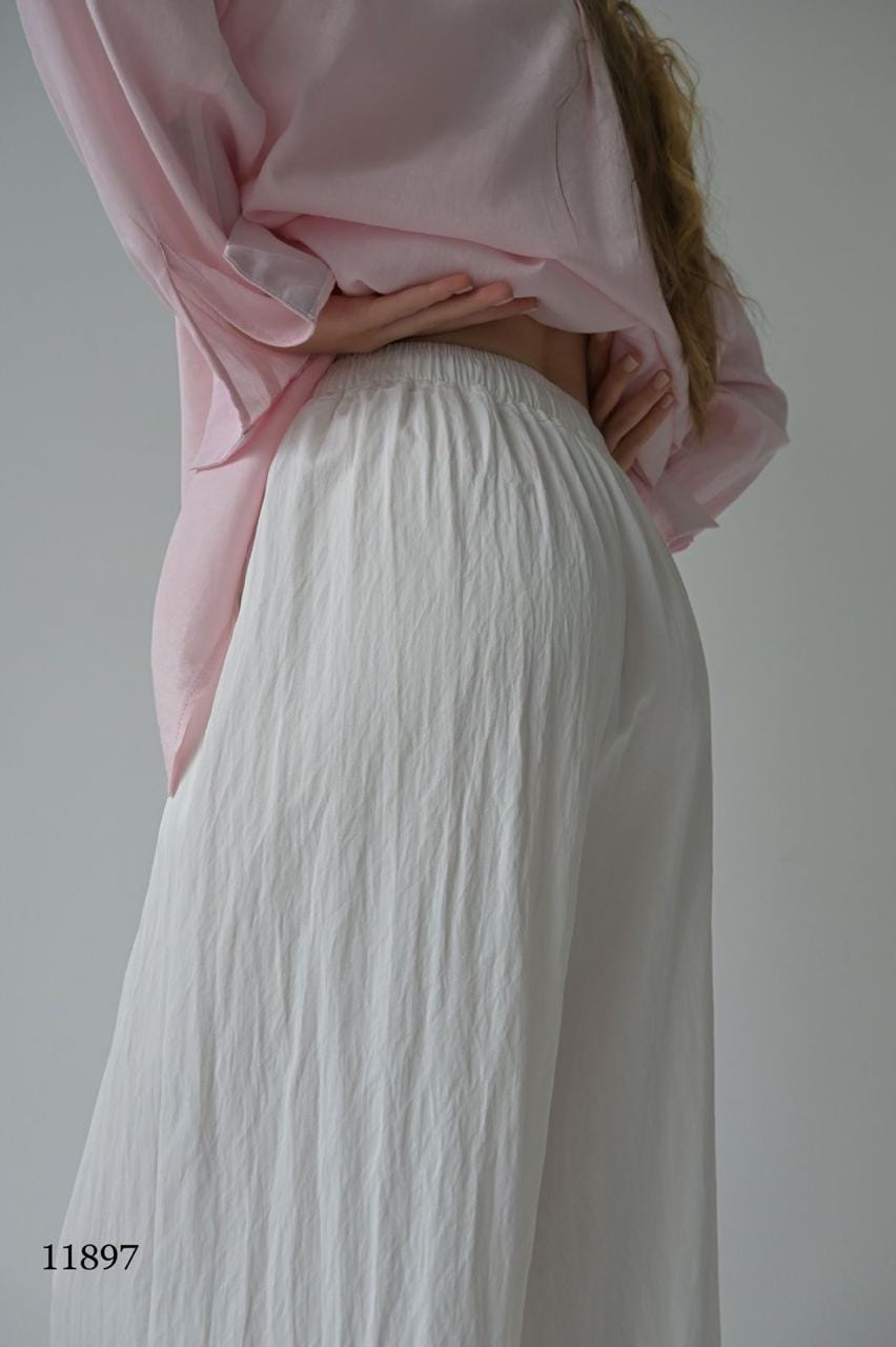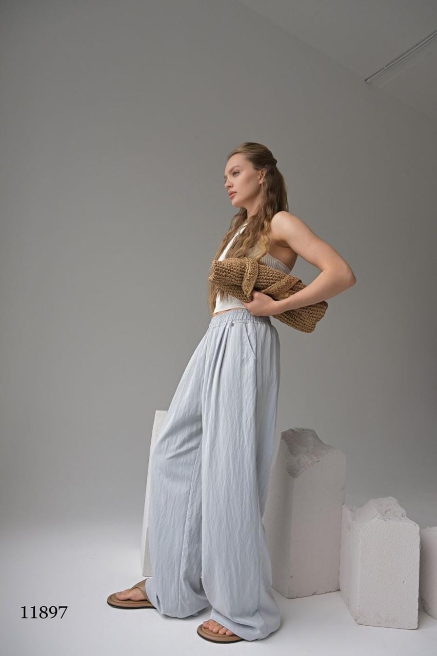 Эти брюки — воплощение расслабленного шика. Лёгкая ткань с жатым эффектом создаёт текстуру и объём, а свободный крой дарит комфорт в движении. Идеальны для прогулок, путешествий и стильных будней.