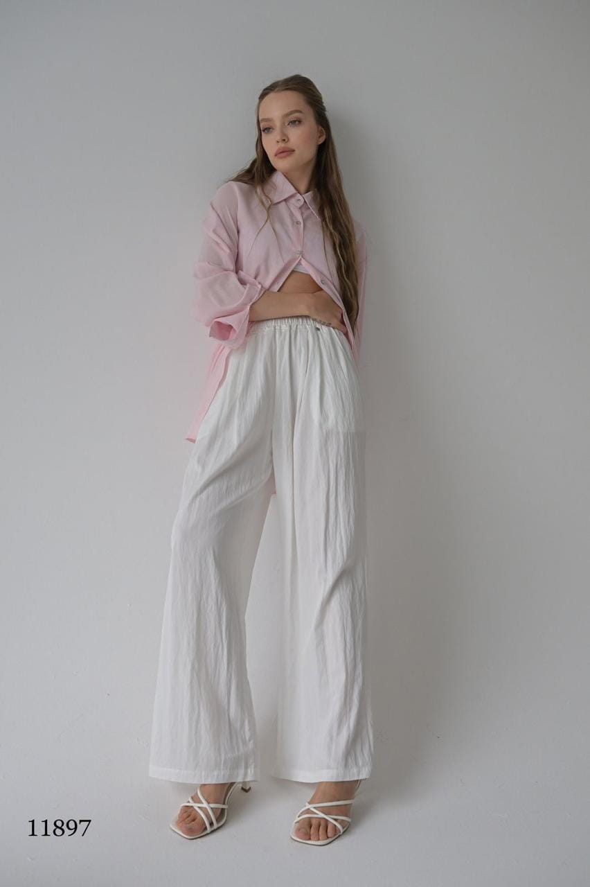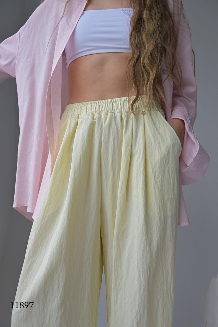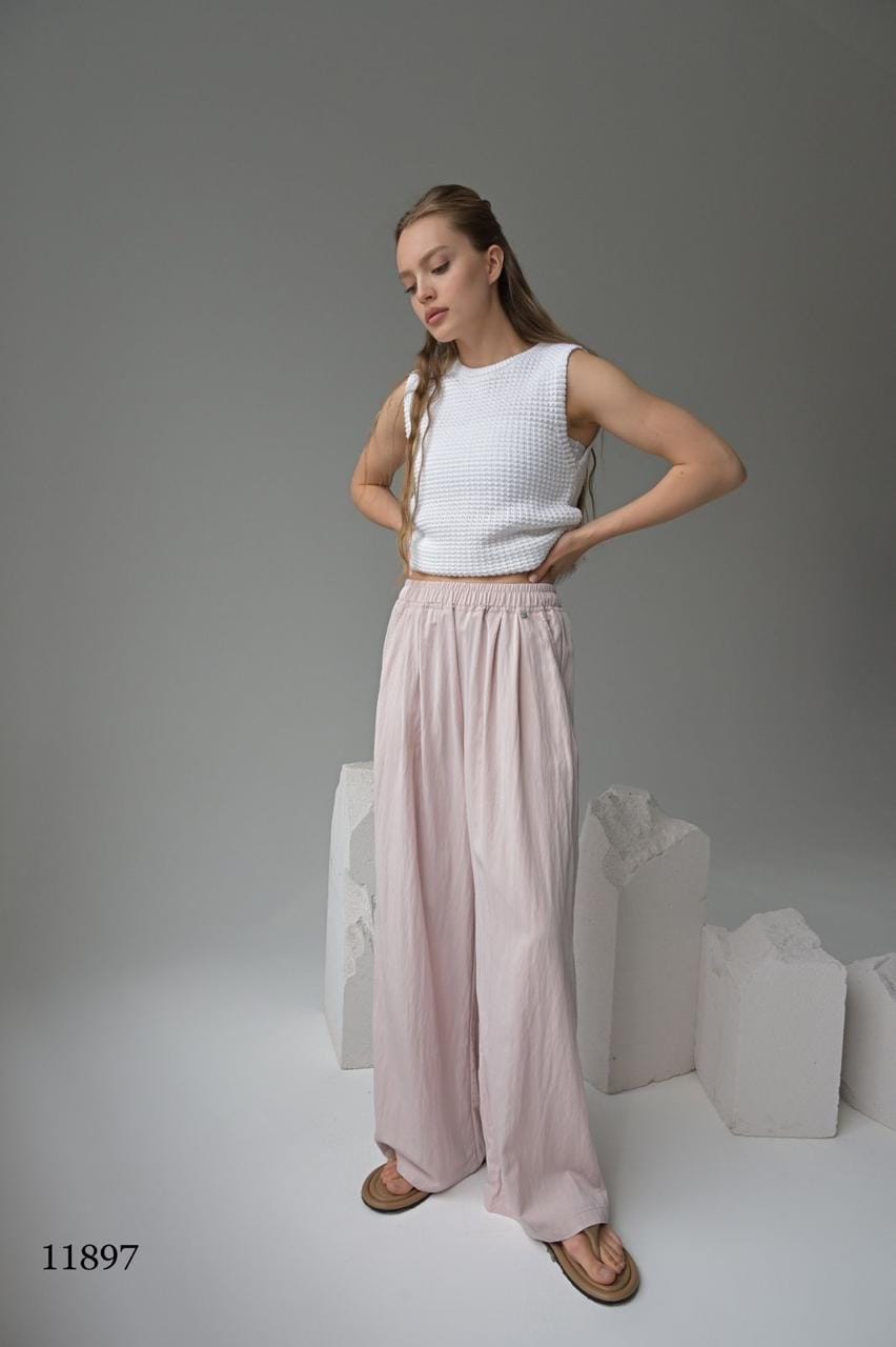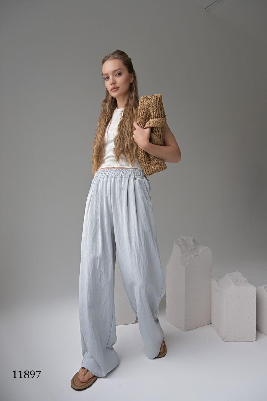 Эти брюки — воплощение расслабленного шика. Лёгкая ткань с жатым эффектом создаёт текстуру и объём, а свободный крой дарит комфорт в движении. Идеальны для прогулок, путешествий и стильных будней.
