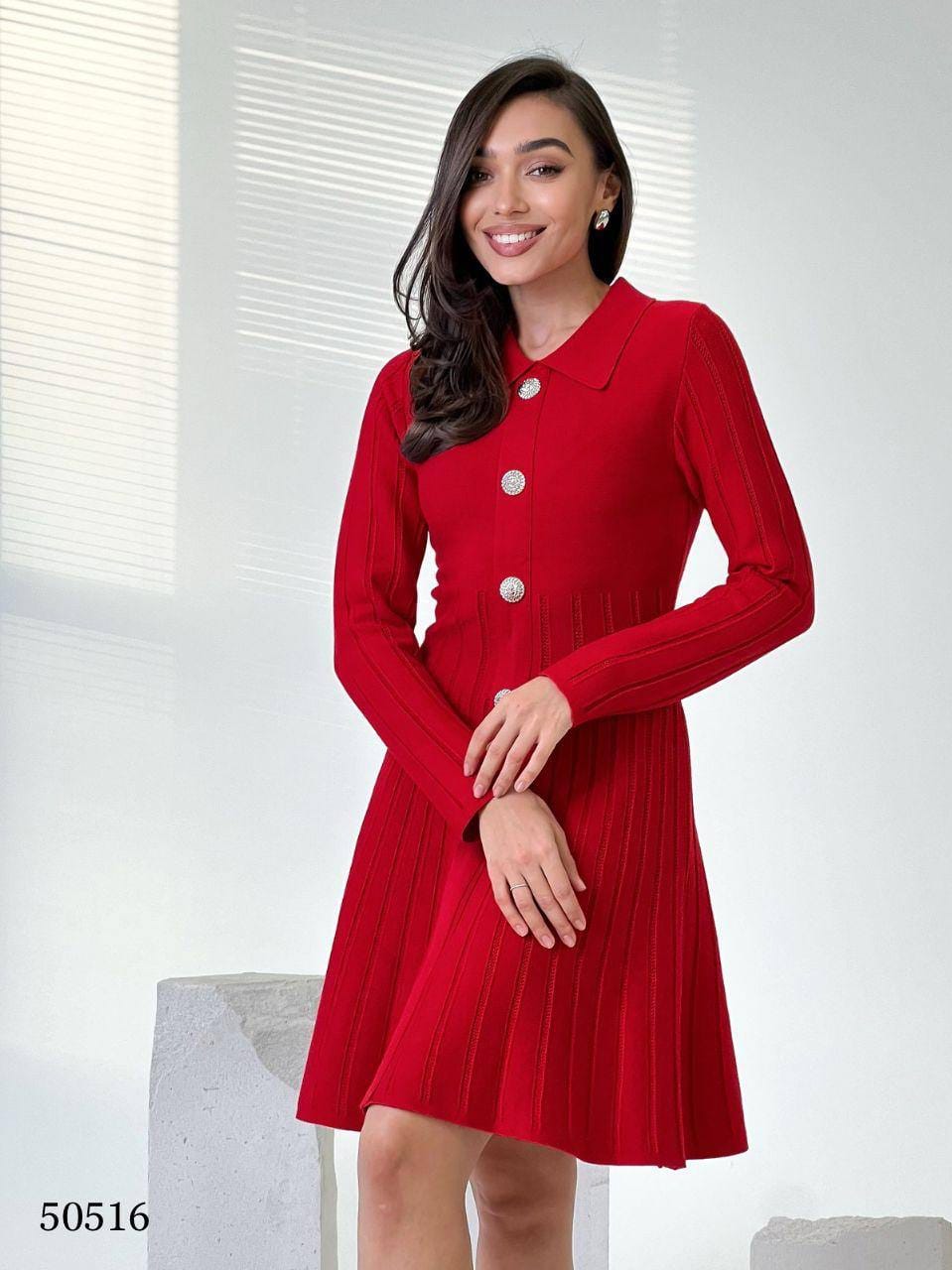 Трикотажное платье с воротником и декоративными пуговицами — элегантный вариант для осеннего гардероба Цвет красный — насыщенный, выразительный, подчёркивает индивидуальность Фасон приталенный, с расклешённой юбкой и акцентом на линии талии Материал — кашемир с хлопком: мягкий, тёплый, приятный к телу Подходит для офиса, прогулок, встреч и повседневных образов
