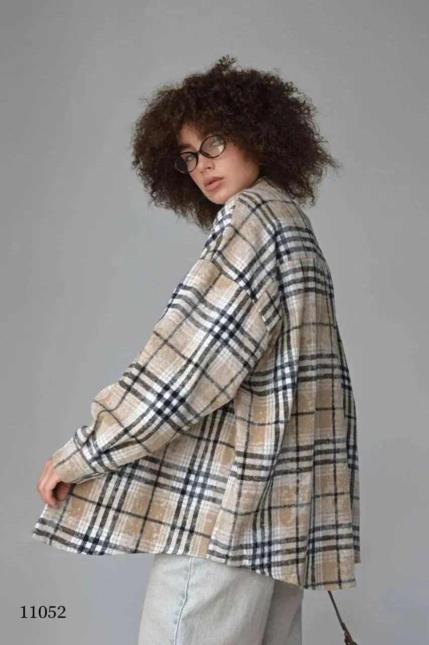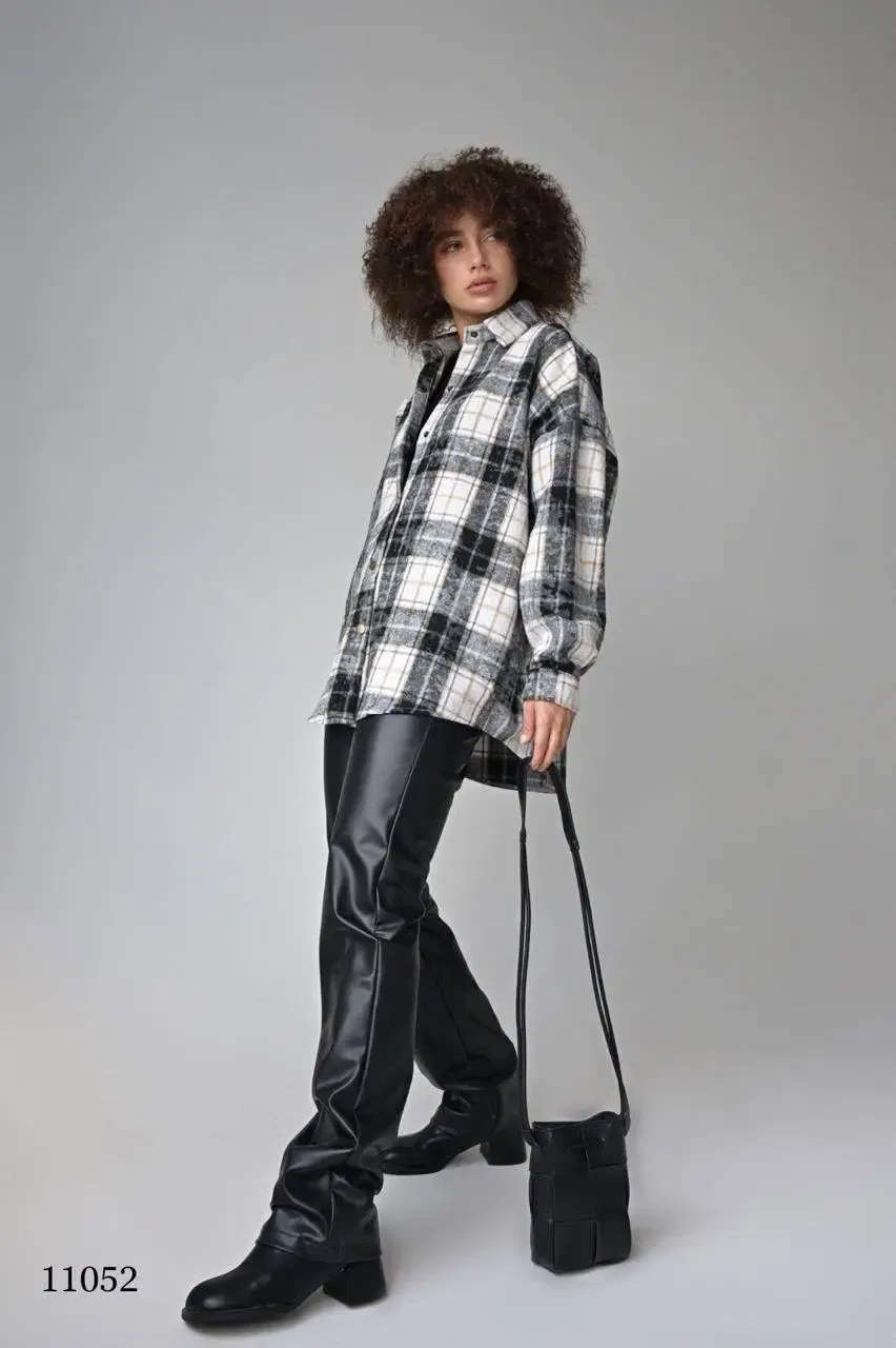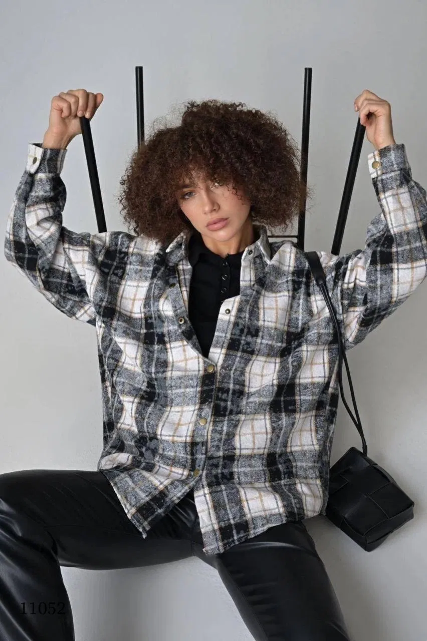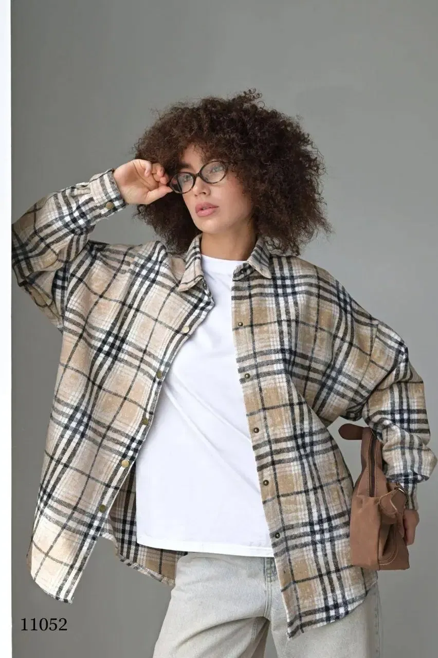 Стильная рубашка из плотной клетчатой ткани (черный, белый, бежевый). Длинные рукава, отложной воротник на кнопках, единый размер (44–52). Идеальна для повседневных и офисных образов. ✅ Бесплатная доставка по Беларуси.