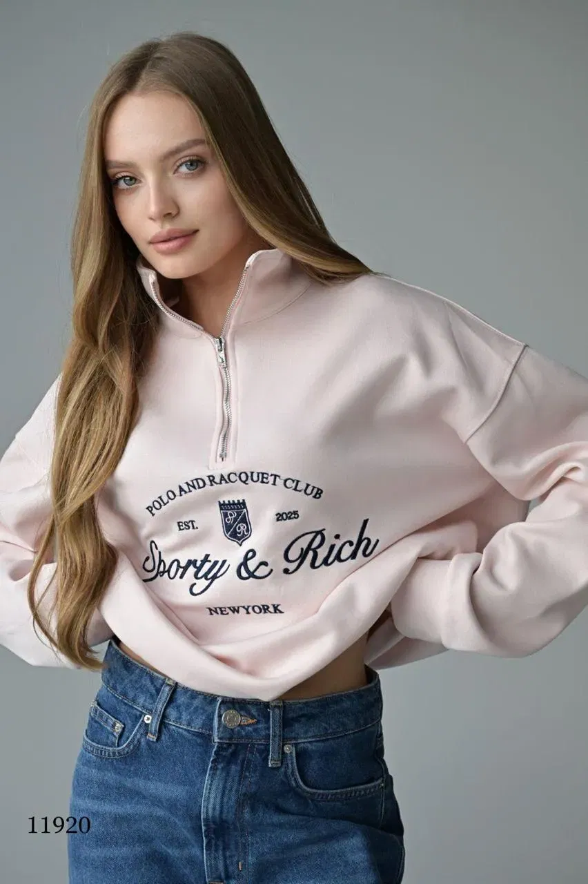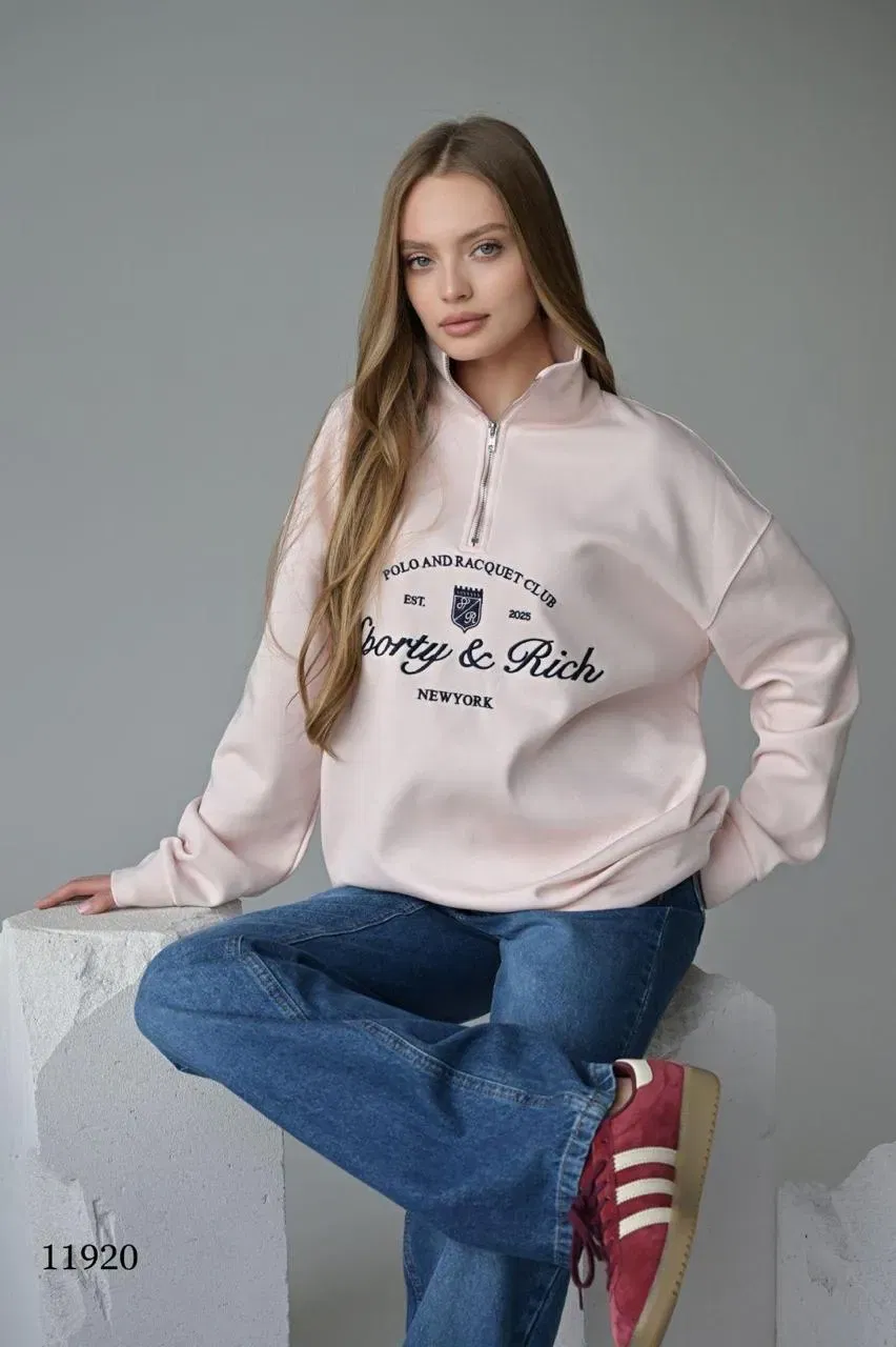 Легкий худи светло-розового оттенка с частичной молнией на груди, выполненный из мягкого трикотажного материала. Модель свободного кроя с длинными рукавами и манжетами на резинке, обеспечивающими дополнительный комфорт. Центральным элементом дизайна является крупная надпись "Polo And Racquet Club EST. 2025 Borty & Rich New York", расположенная спереди. Логотип выполнен в классическом шрифте черного цвета, придавая изделию стильный и элегантный вид. Кофта отлично подойдет для повседневной носки, сочетаясь с джинсами или спортивными брюками. Идеально подходит для тех, кто ценит комфорт и современный городской стиль.