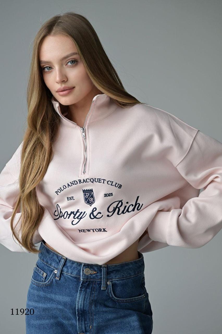 Свитшот на молнии с воротником‑стойкой и крупным принтом в стиле sporty chic.