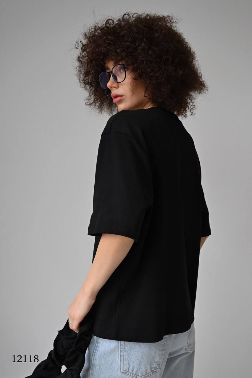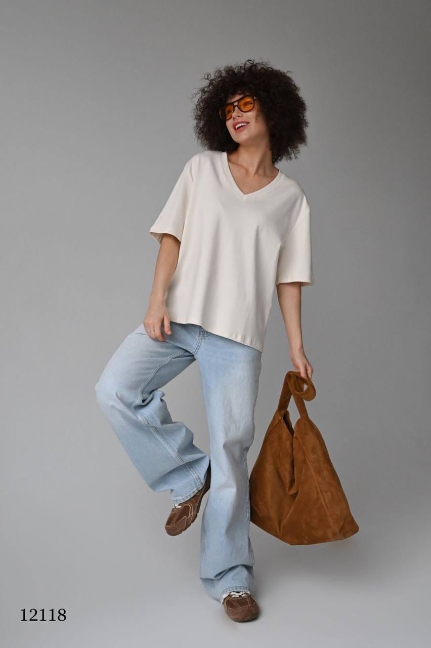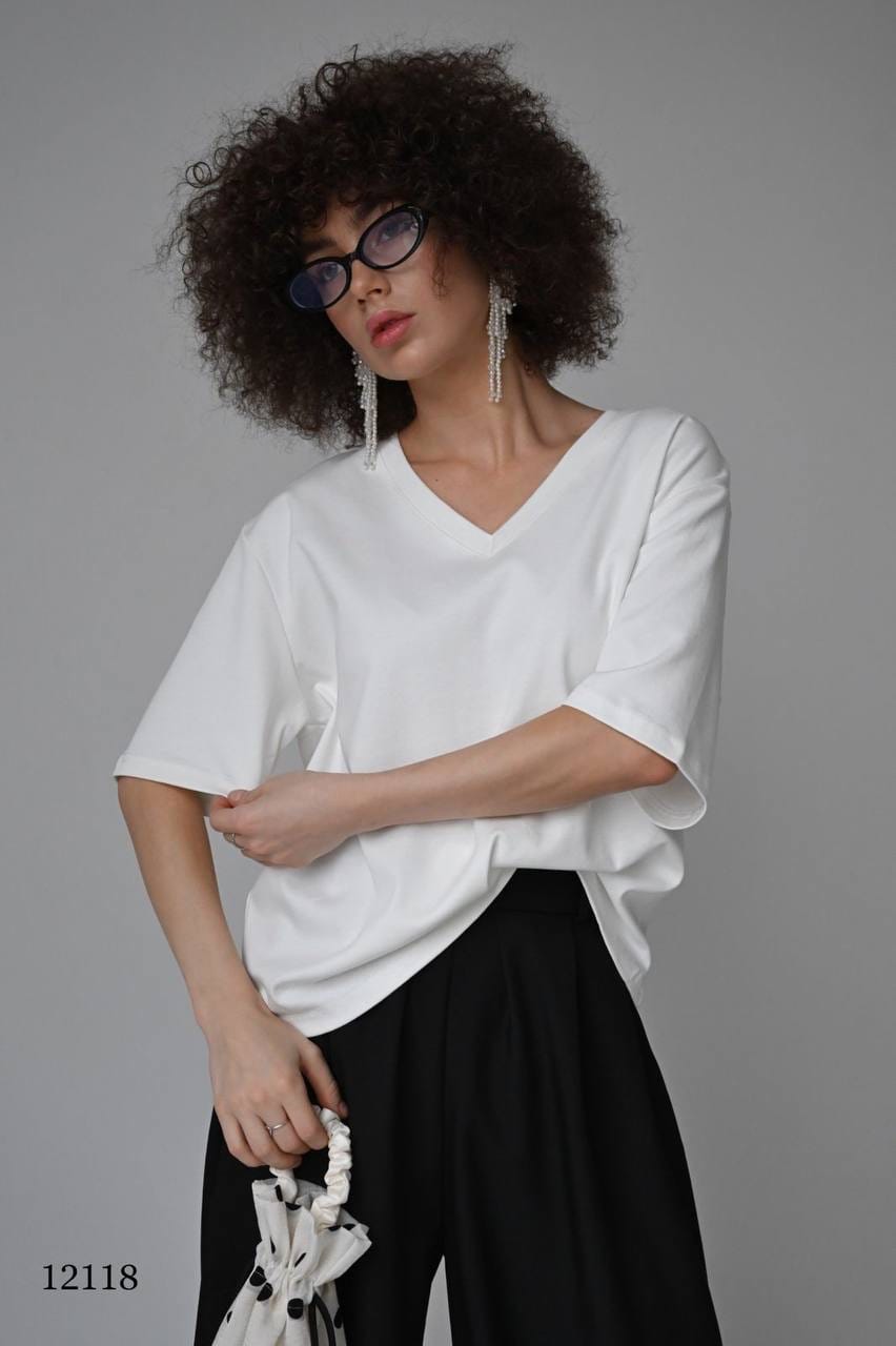 Эта свободная футболка с V-образным вырезом создана для тех, кто ценит комфорт и стиль в повседневной жизни. Модель единого размера (44–52) благодаря свободному крою подходит на разные типы фигуры, а V-вырез визуально вытягивает силуэт и добавляет образу женственности.