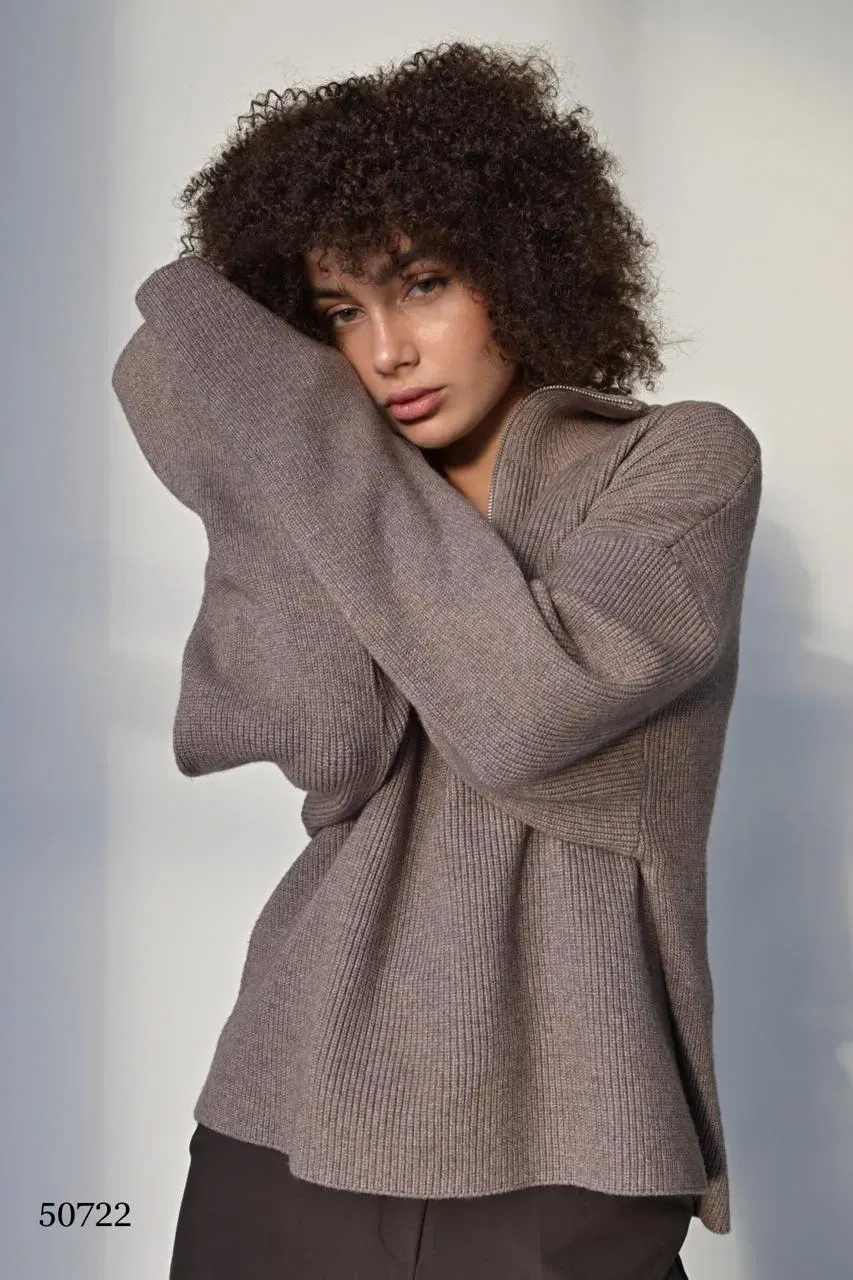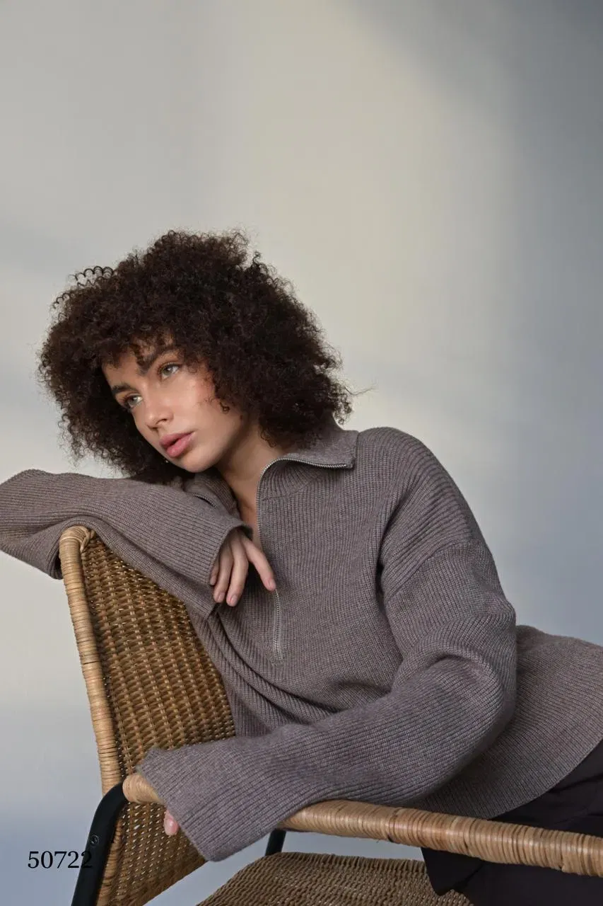 Свободная кофта коричневого цвета с рельефной фактурой, стоячим воротником и молнией MISS DIVA