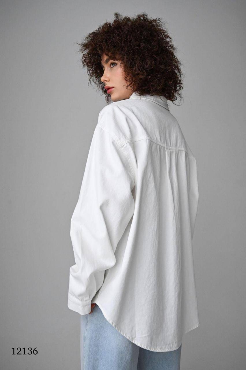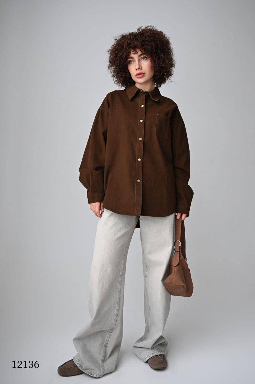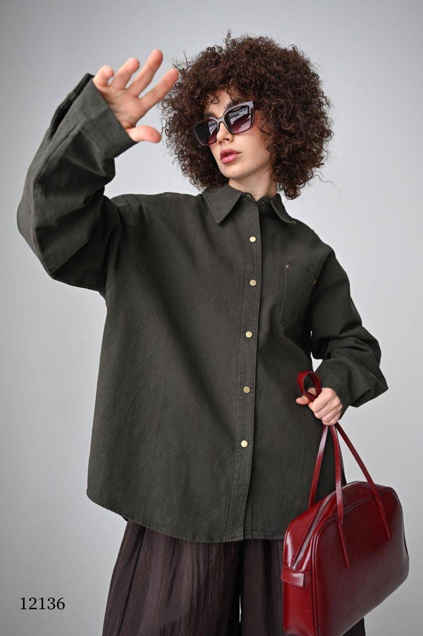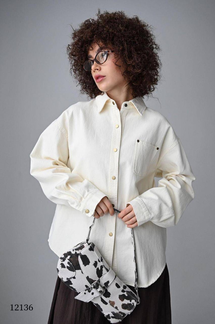 Стильная рубашка оверсайз из плотной джинсовой ткани. Отложной воротник, золотистые пуговицы-кнопки, свободные рукава с манжетами. Размер onesize (44–52). ✅ Бесплатная доставка по Беларуси.