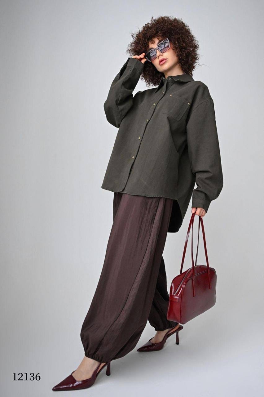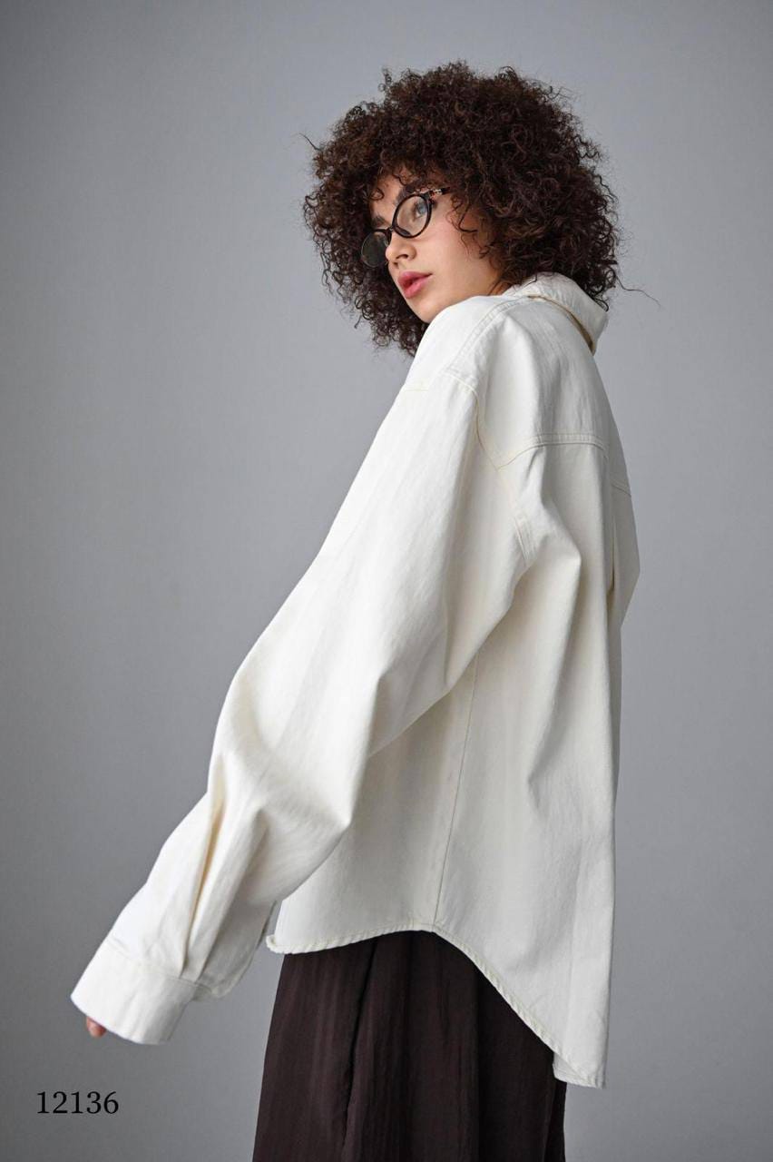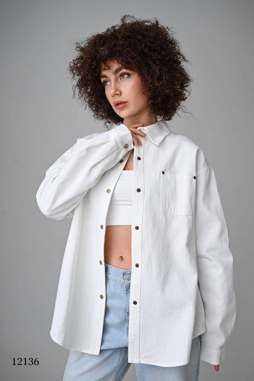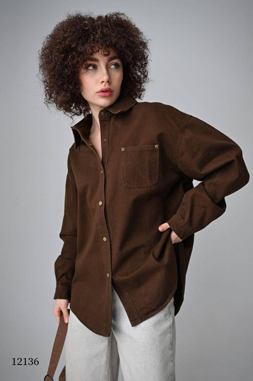 Стильная рубашка оверсайз из плотной джинсовой ткани. Отложной воротник, золотистые пуговицы-кнопки, свободные рукава с манжетами. Размер onesize (44–52). ✅ Бесплатная доставка по Беларуси.