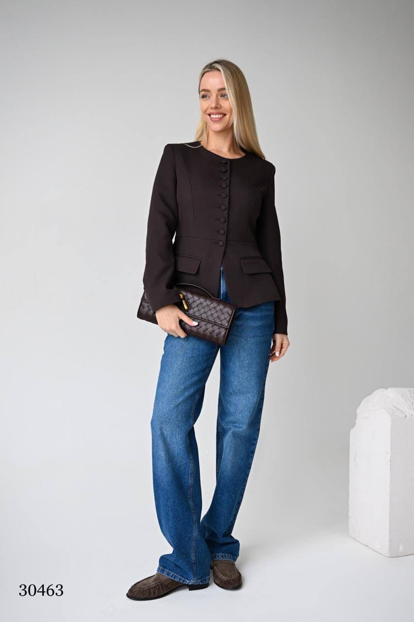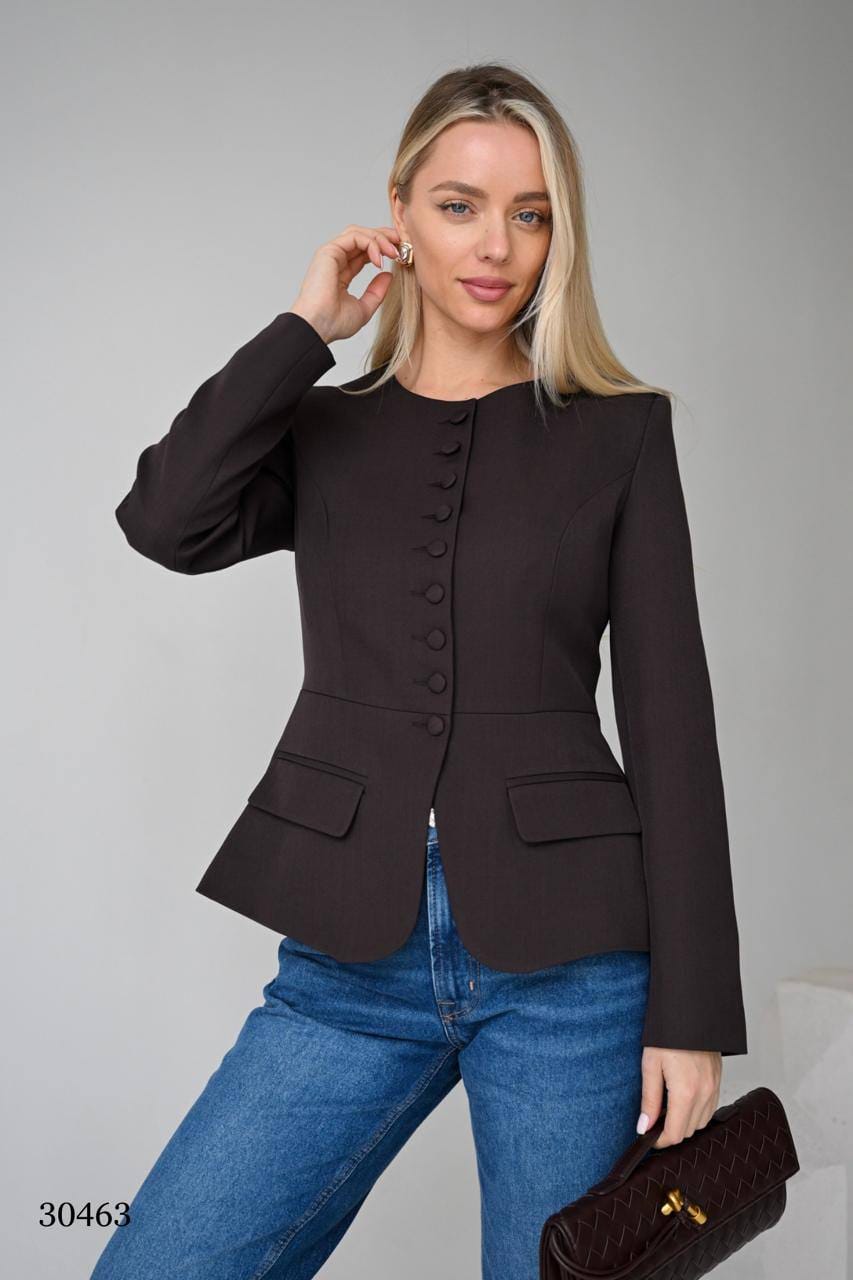 Элегантный приталенный пиджак темно-коричневый с круглым вырезом и накладными карманами MISS DIVA
