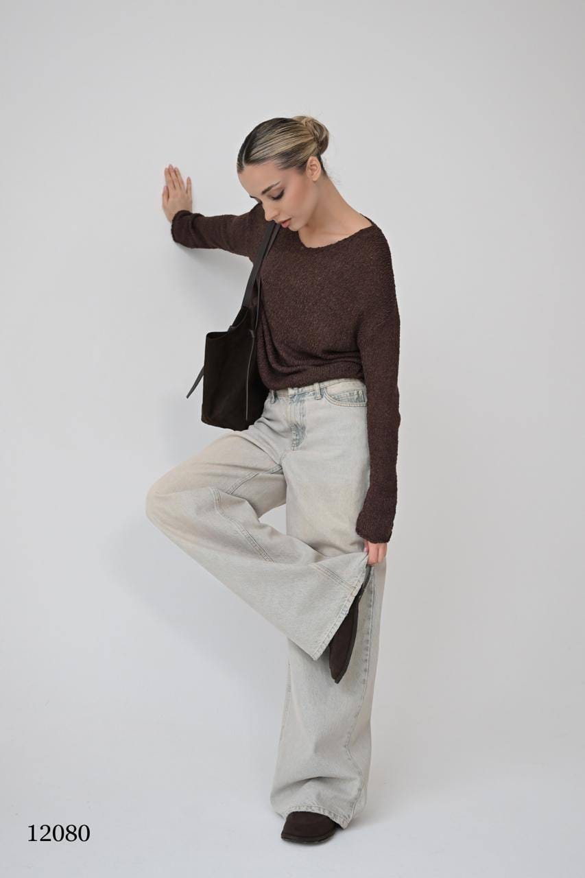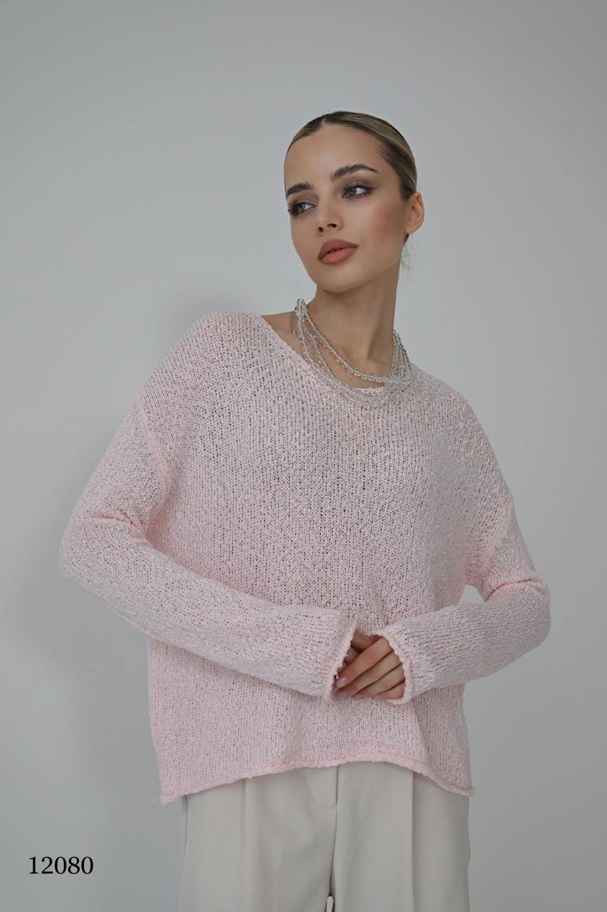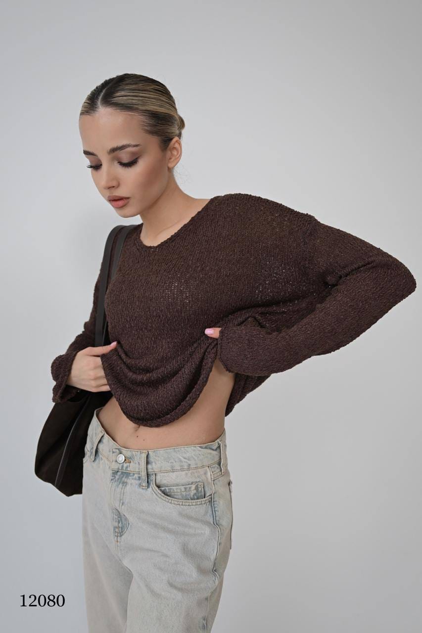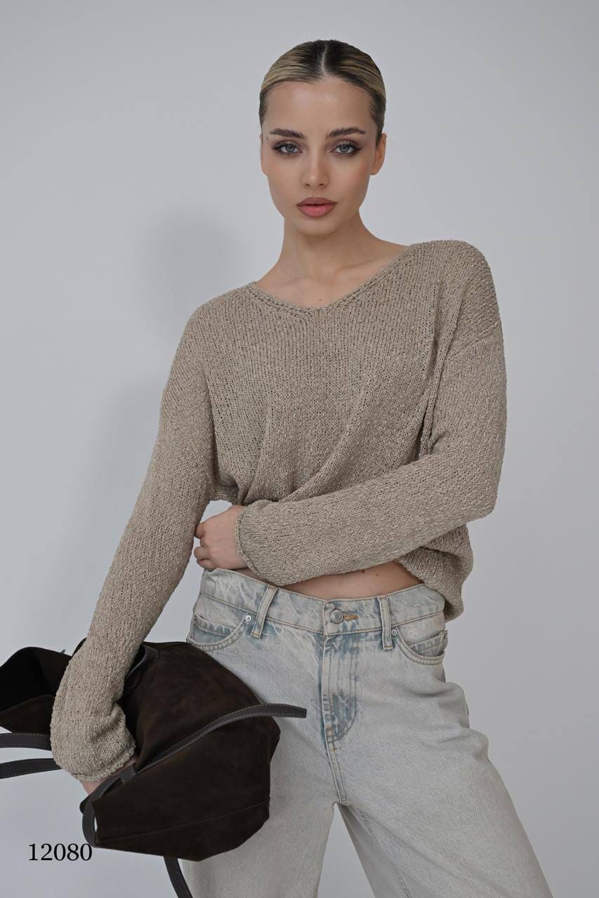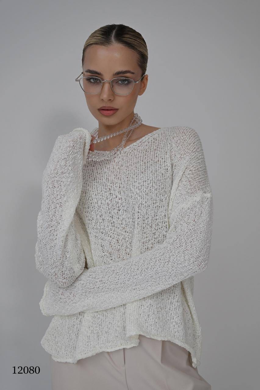 Джемпер свободного кроя с длинными рукавами и округлым вырезом.