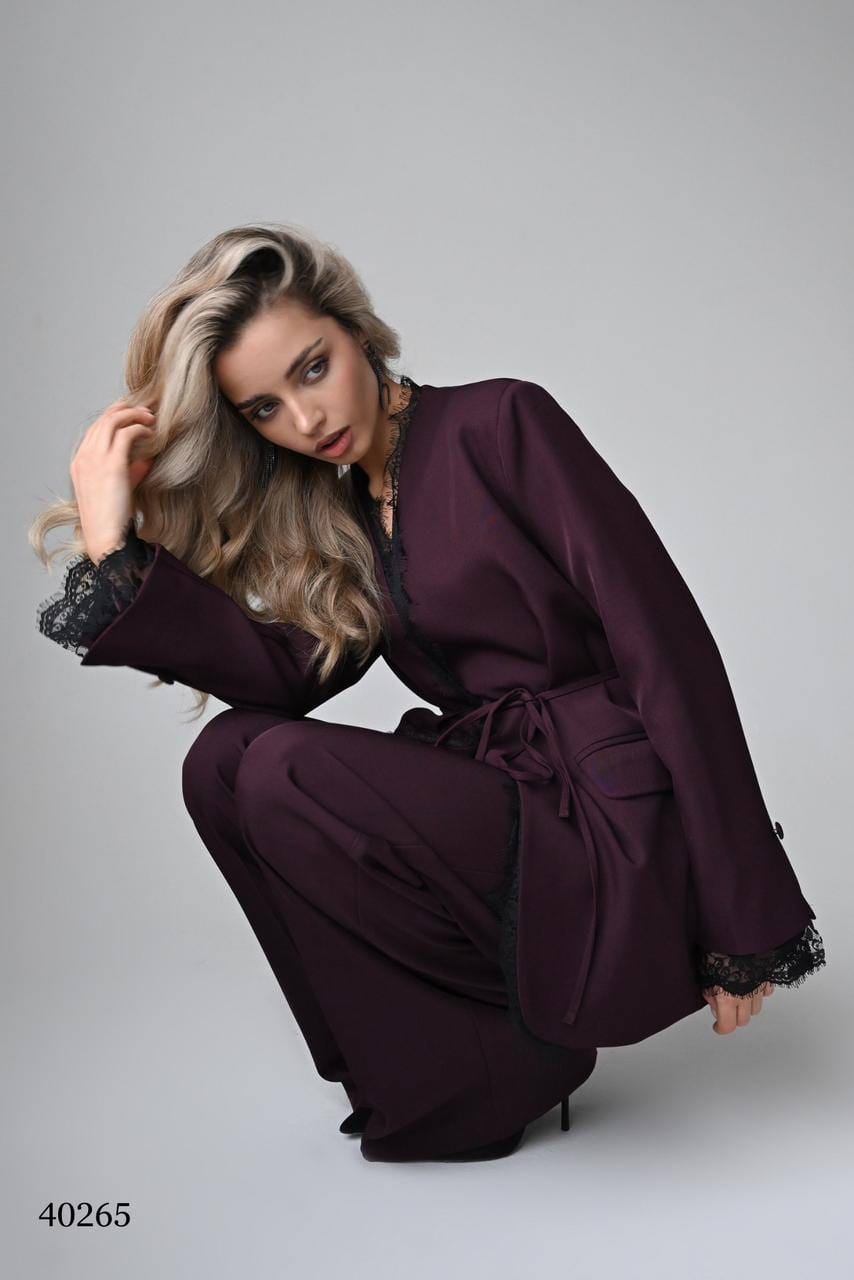 Костюм состоит из пиджака с запахом, поясом и декоративной кружевной отделкой по борту, а также широких брюк с высокой посадкой.