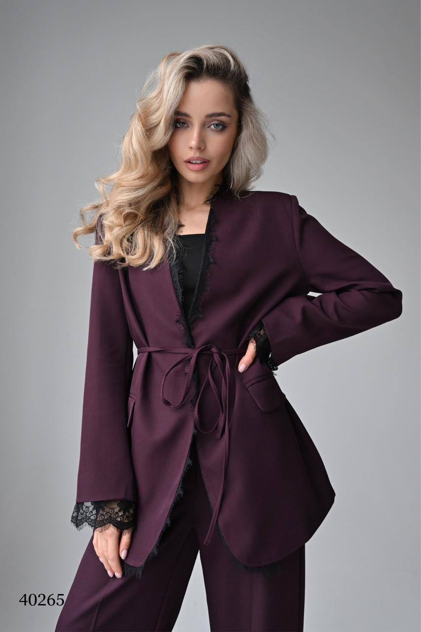 Костюм состоит из пиджака с запахом, поясом и декоративной отделкой по борту, а также широких брюк с высокой посадкой.