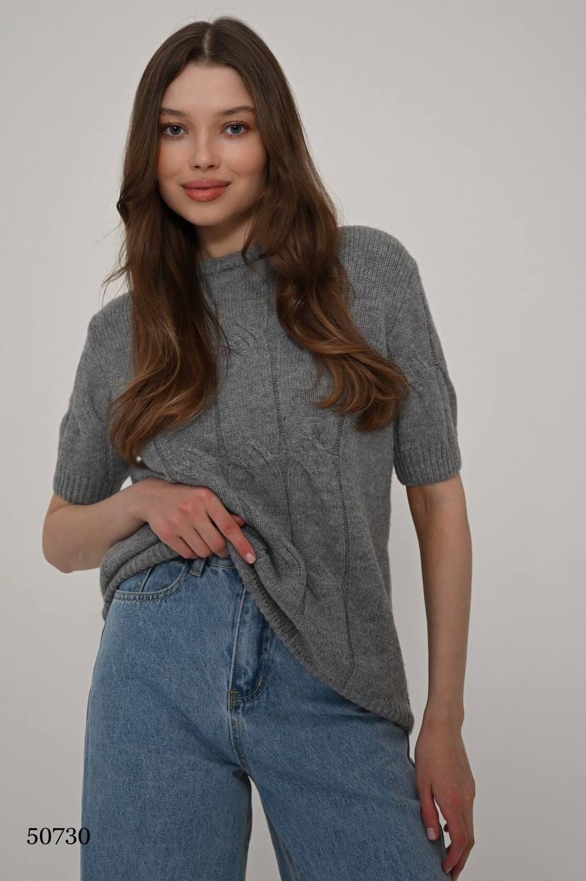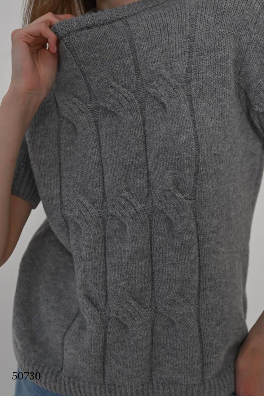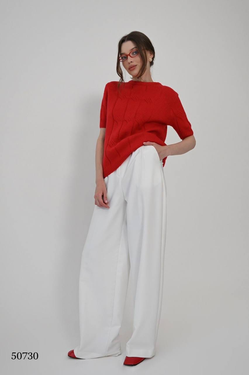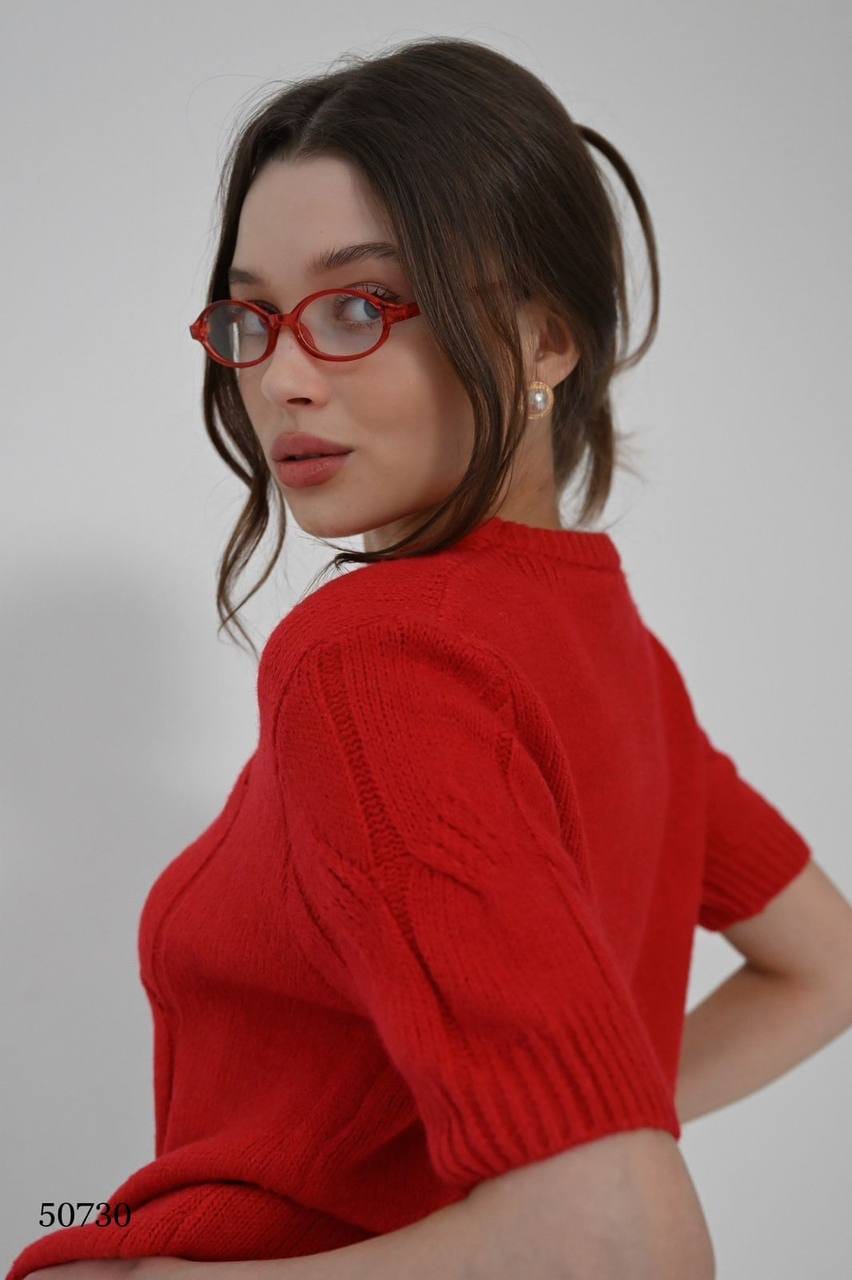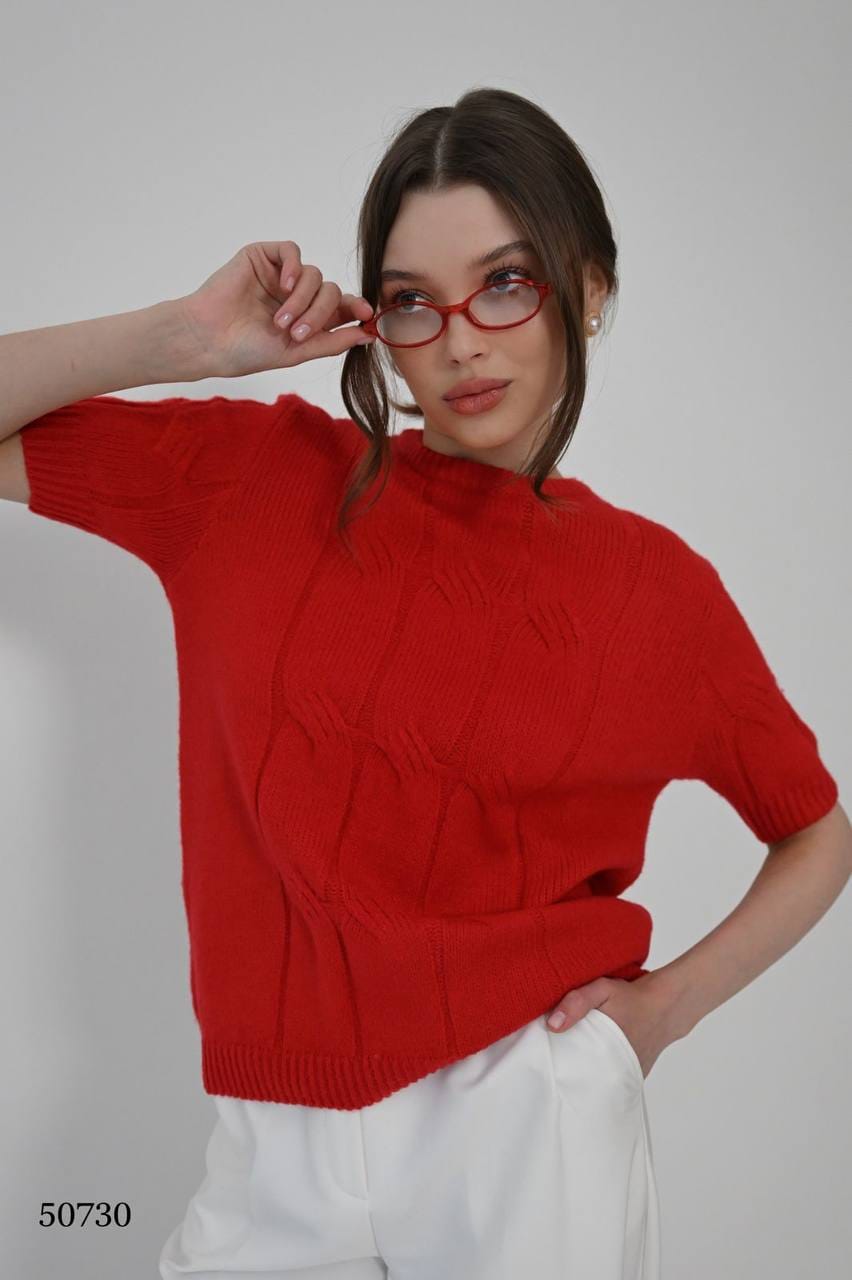 Женский красный джемпер с фактурной вязкой и коротким рукавом