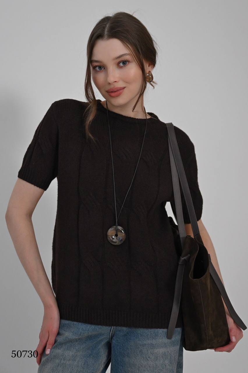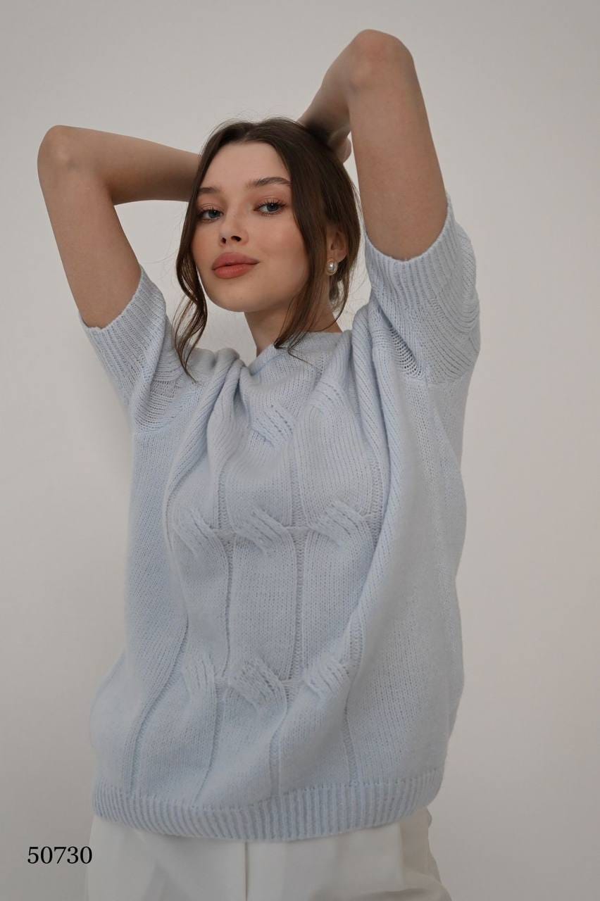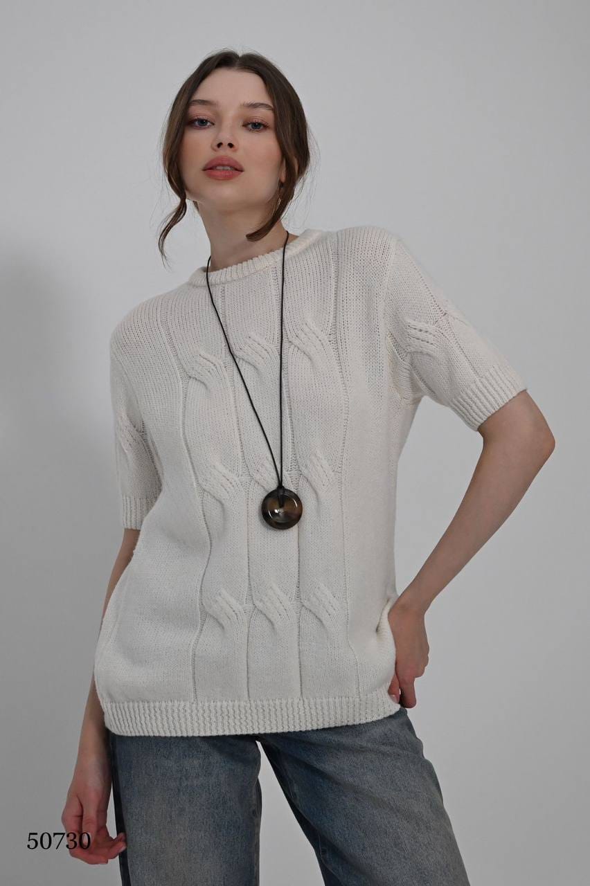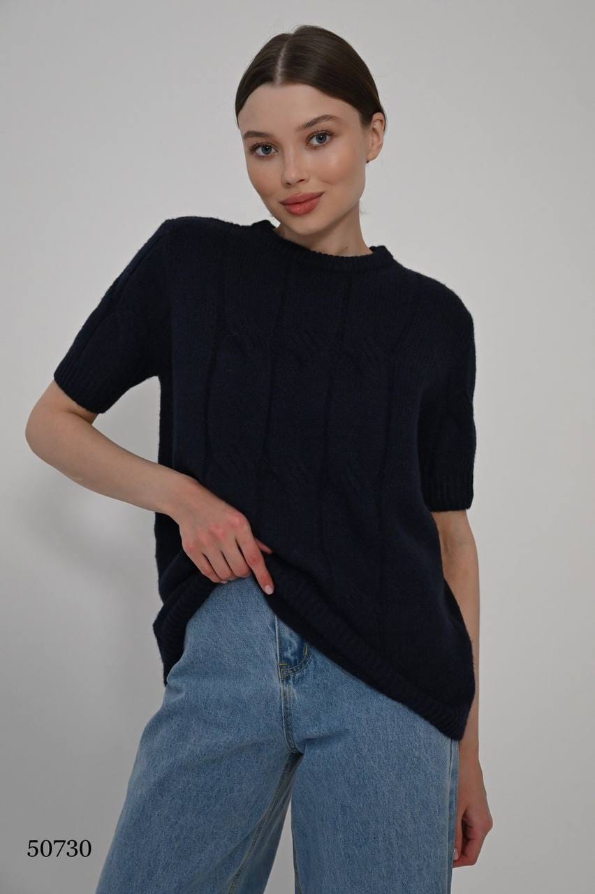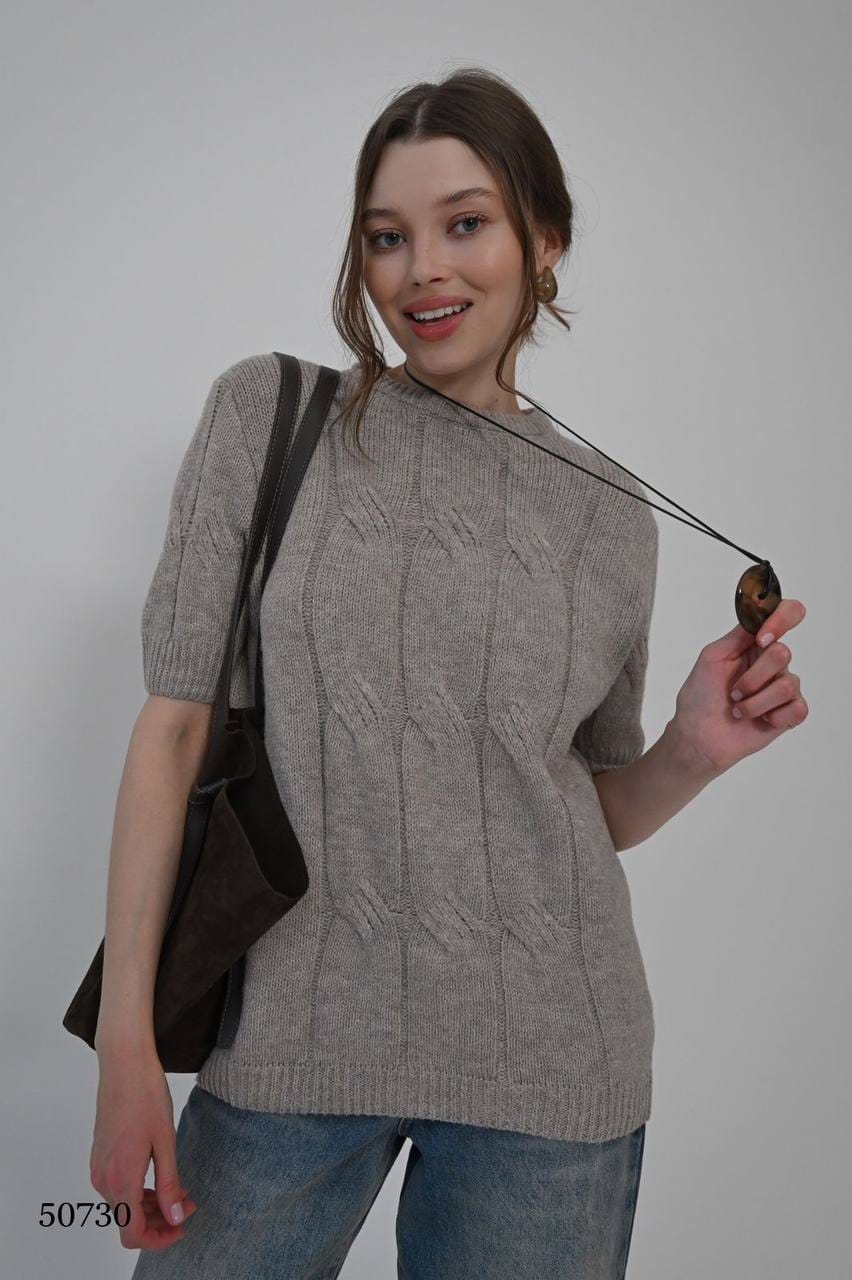 Женский красный джемпер с фактурной вязкой и коротким рукавом